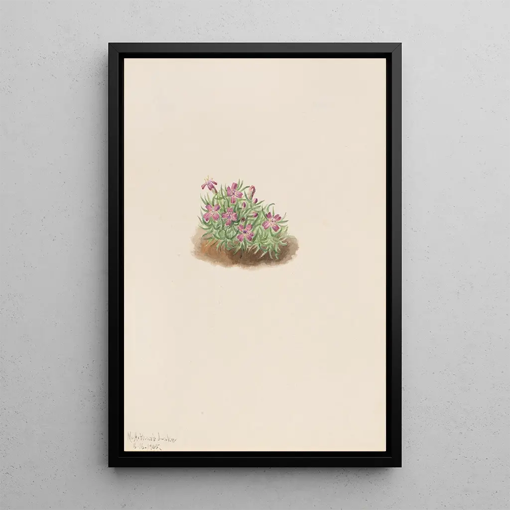 Den kunsttryk "Silène acaule" af Mary Vaux Walcott afslører den delikate skønhed af denne alpine plante, som ofte er ukendt. Pastelfarver, der spænder fra blid rosa til frisk grøn, blander sig harmonisk for at skabe en blid og beroligende atmosfære. Akvarelteknikken, brugt med mesterlighed, gør det muligt at gengive letheden af blomsterbladene og finheden af bladene. Hvert detalje er omhyggeligt observeret, hvilket giver en næsten poetisk vision af floraen. Dette maleri inviterer til en flugt ind i bjerglandskaber, hvor naturens enkelhed afsløres i al sin pragt.
