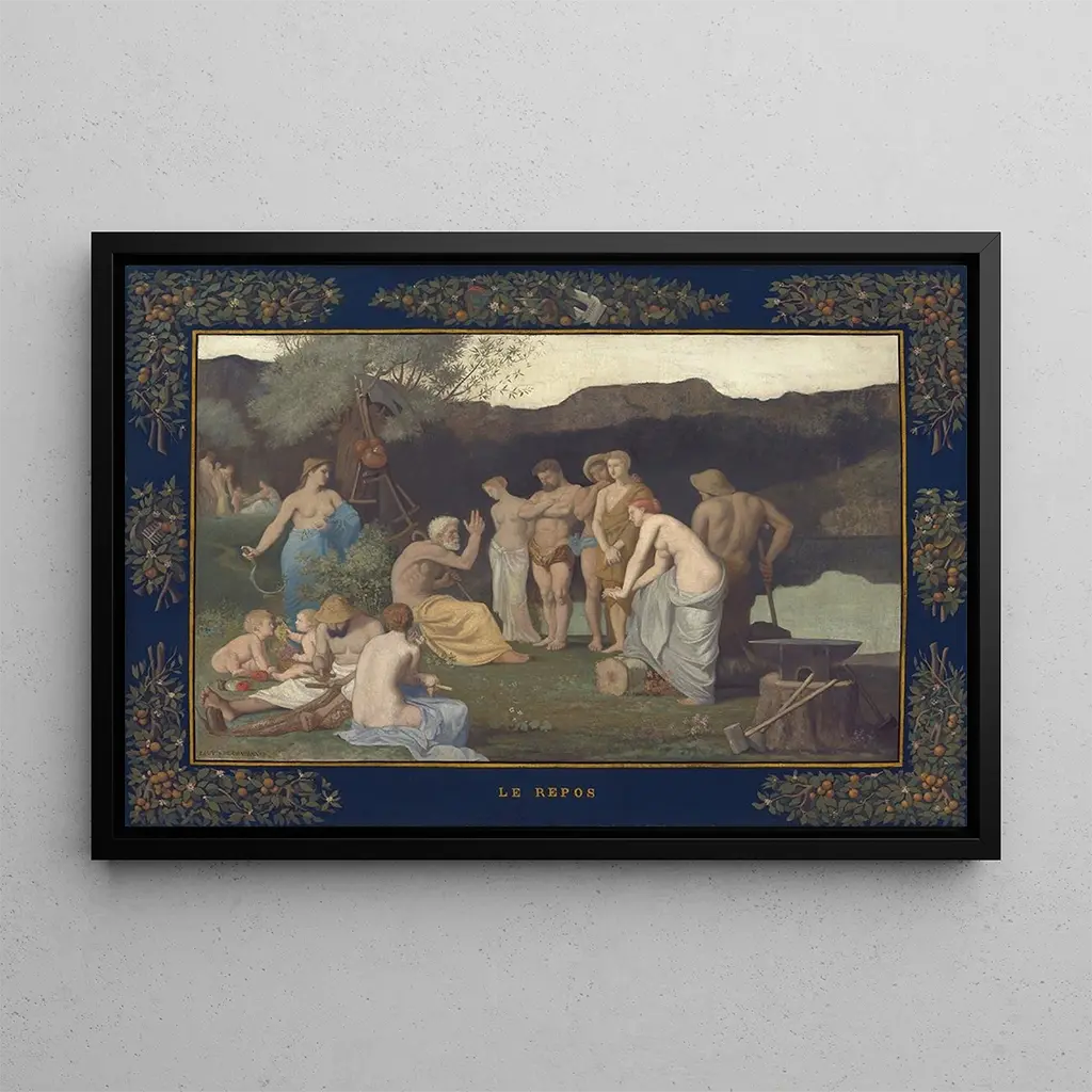 I dette værk tager Pierre Puvis de Chavannes os med til en verden af fred og ro. Kompositionen fremhæver menneskelige figurer, der hviler i et grønt landskab, badet i blid og beroligende lys. Pastelfarver, domineret af grønne og blå nuancer, skaber en drømmeagtig og kontemplativ atmosfære. Kunstnerens teknik, der kombinerer symbolisme med en impressionistisk berøring, inviterer betragteren til at drømme væk og føle denne stilheds øjebliks fred. Hvert detalje, hver nuance, bidrager til den overordnede harmoni i dette lærred, hvilket gør dette kunsttryk til et ægte billede af ro.