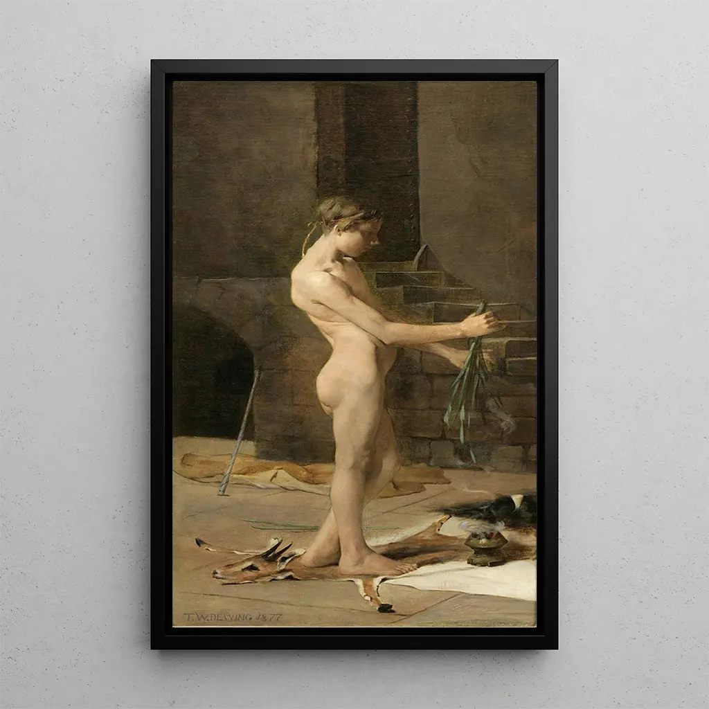 L'Esclave du sorcier : en kunsttryk, der er fyldt med mystik og poesi L'Esclave du sorcier, fængslende maleri af Thomas Wilmer Dewing, fremkalder en fortryllende atmosfære takket være sin palette af bløde farver og sine delikate former. Kompositionen, centreret omkring en kvindelig figur, udstråler en følelse af ro, samtidig med at den antyder en underliggende spænding. Nuancerne af blå og grøn, kombineret med strejf af gyldent lys, skaber en slående kontrast, der fanger øjet. Dewings teknik, kendetegnet ved en subtil behandling af teksturer og skygger, bidrager til værkets mystiske aura og inviterer betragteren til at dykke ned i en både drømmende og foruroligende verden. Thomas Wilmer Dewing : en mester i amerikansk symbolisme Thomas Wilmer Dewing, aktiv i slutningen af 1800-tallet og begyndelsen af 1900-tallet, er anerkendt som en af de væsentligste repræsentanter for den amerikanske symbolistbevægelse. Påvirket af pre-rafaelitterne og impressionistisk maleri, formåede Dewing at udvikle en unik stil, der forener skønheden i former med en drømmende atmosfære. Hans værk skiller sig ud ved en særlig opmærksomhed på lys og farve samt på fremstillingen af idealiserede kvindefigurer. L'Esclave du sorcier, skabt på et tidspunkt hvor amerikansk kunst søgte at etablere sig på den internationale scene, vidner om Dewings betydning i udviklingen af kunst i USA. En dekorativ tilføjelse med mange fordele Kunsttrykket af L'Esclave du sorcier er et ideelt valg til at forskønne dit hjem, uanset om det er stue, kontor eller soveværelse. Dets kvalitet som kunsttryk sikrer en bemærkelsesværdig trofasthed over for det originale værk, hvilket gør det muligt at nyde skønheden af dette ikoniske lærred dagligt. Det æstetiske tiltrækningskraft ved dette værk, med sine beroligende farver og sin mystiske stemning, vil tilføre elegance og sofistikation til din indretning. Ved at vælge dette kunsttryk vælger du et billede, der uden tvivl vil vække nysgerrighed og berige dit opholdsrum.