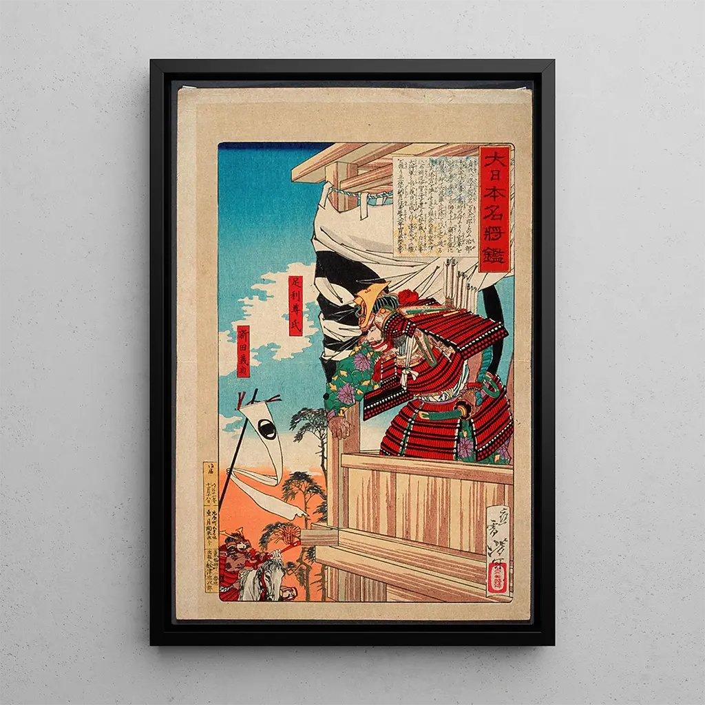 I dette slående kunsttryk illustrerer Tsukioka Yoshitoshi et vigtigt øjeblik i japansk historie, hvor de ikoniske figurer Ashikaga Takauji og Nitta Yoshisada mødes i kamp. Den dynamiske komposition og de livlige farver formidler spændingen og intensiteten i kampen. De detaljerede rustninger og udtryk på figurerne fordyber seeren i denne historiske scene, hvor mod og skæbne krydser hinanden. Yoshitoshi, med sit talent for at fange bevægelse, gør dette kunsttryk til et levende maleri, hvor hvert element fortæller en historie.