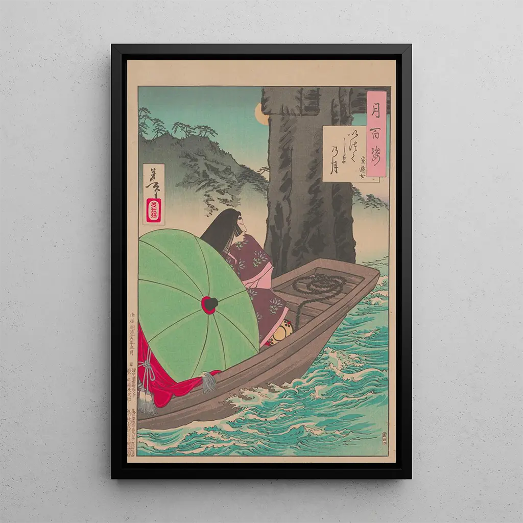 La kunsttryk af lærredet Lune d'Itsukushima fremkalder en mystisk atmosfære, hvor månen reflekteres på de rolige vande i Itsukushima-bugten. De sølv- og blålige nuancer skaber en slående kontrast til de mørke silhuetter af torii og bjergene i baggrunden. Tsukioka Yoshitoshi, mester af den japanske ukiyo-e, bruger delikate graveringsmetoder til at fange naturens flygtige skønhed. Dette værk inviterer til en stille eftertanke, hvor hver detalje synes at hviske gamle historier, og hylder den japanske landskabs åndelige dimension.