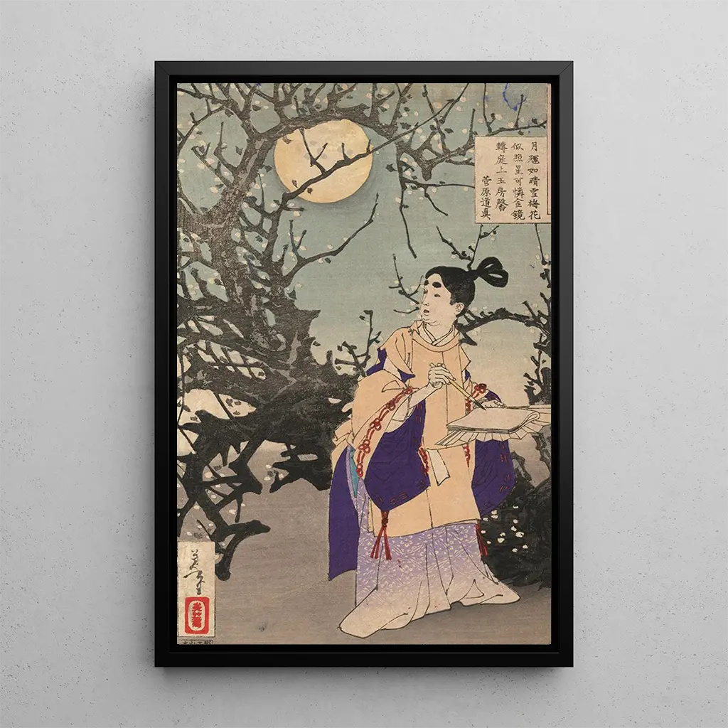 I dette ikoniske kunstværk præsenterer Tsukioka Yoshitoshi Sugawara no Michizane, en æret historisk skikkelse i Japan. Maleriet skildrer figuren i en eftertænksom positur, omgivet af symboler på visdom såsom gruefjer. De bløde farver og delikate nuancer skaber en fredelig, næsten kontemplativ stemning. Ukiyo-e-teknikken tillader at fange dybden af følelser, hvilket gør dette kunsttryk af Sugawara no Michizane både rørende og inspirerende, og inviterer seeren til at dykke ned i historien om denne legendariske figur.