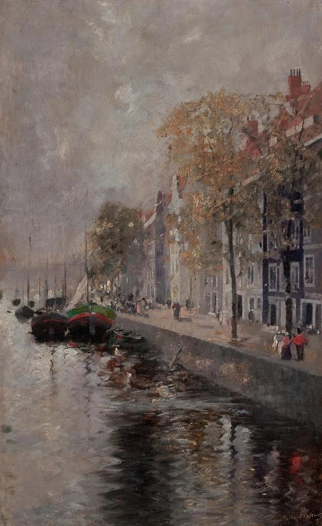 Friedrich Stahl, aktiv i det 19. århundrede, er kendt for sit talent til at skildre bylandskaber med en unik følsomhed. Påvirket af den romantiske bevægelse har han formået at fange skønheden i europæiske byer, især Amsterdam. Hans værk skiller sig ud ved sin omhyggelige opmærksomhed på arkitektoniske detaljer og lys, hvilket giver det en næsten poetisk dimension. Gennem sine malerier inviterer Stahl betragteren til at genopdage velkendte steder i et nyt lys, hvilket gør ham til en væsentlig kunstner for at forstå udviklingen af landskabsmaleri i denne periode.