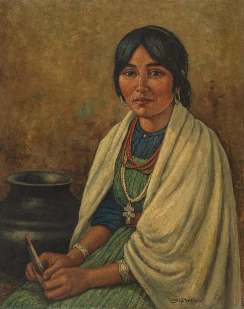 Carl Moon, født i 1878, er en kunstner, hvis karriere er dybt forankret i den amerikanske kunsthistorie. Opvokset i et kunstnerisk miljø, udviklede han hurtigt en interesse for amerikanske indianerkulturer, som han udforskede gennem sine rejser i det sydvestlige USA. Hans engagement i en autentisk skildring af de indfødte folk kommer til udtryk i hans værker, der kombinerer respekt og beundring. Moon nøjes ikke med at male portrætter; han søger at fange sjælen i de emner, han skildrer, gennem en dialog mellem kunst.
