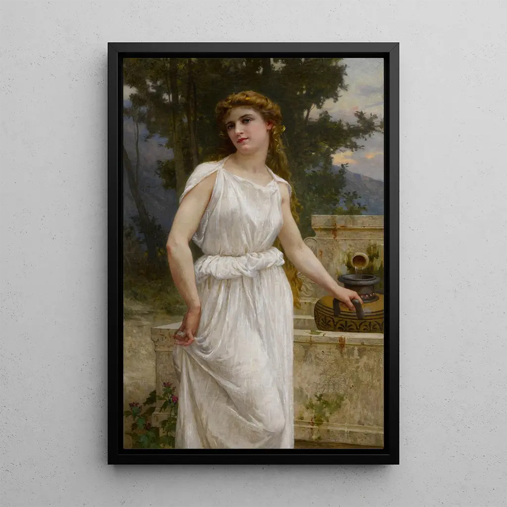 Ved fontænen, et delikat kunsttryk af Guillaume Seignac, indfanger en scene præget af ynde og fred. Kompositionen fremhæver en ung kvinde, klædt i en let kjole, der nærmer sig en fontæne, symbol på renhed og fornyelse. Pastelfarver, bløde og beroligende, skaber en drømmende atmosfære, mens det naturlige lys synes at kærtegne de delikate former af den kvindelige figur. Seignacs teknik, kendetegnet ved en slående realisme, inviterer betragteren til at dele dette øjeblik af ro, hvor naturen og menneskeheden mødes.