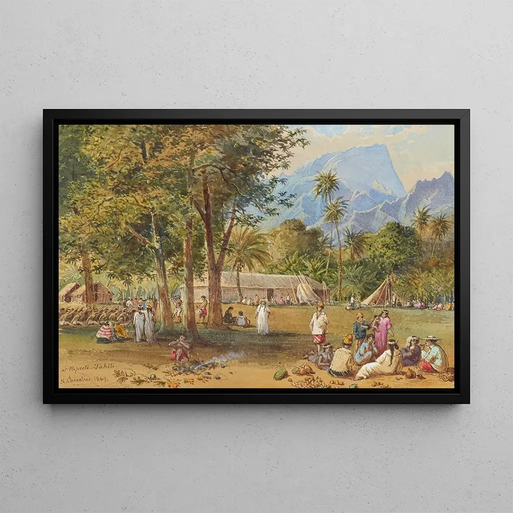I Papeete, Tahiti: en rejse til hjertet af troperne. Nicholas Chevalier giver os med "I Papeete, Tahiti" et åbent vindue til de fortryllende landskaber på øen. Lærredet skildrer livlige scener fyldt med farver, hvor havets blå nuancer blander sig med den frodige grønne vegetation. Detaljerne af palmer og traditionelle hytter fremkalder en atmosfære af ro og eksotisme. Chevalier, gennem sin impressionistiske teknik, formår at fange lyset og den unikke stemning i dette sted, hvilket transporterer betragteren til fjerne, solrige kyster. Nicholas Chevalier: en rejsende kunstner med hjertet i landskabet. Født i 1828, er Nicholas Chevalier en neo-zélandsk maler, der har rejst verden rundt og efterladt et uudsletteligt aftryk i kunstens landskab. Hans ophold i Tahiti i 1860'erne markerer et vendepunkt i hans karriere, hvilket gav ham mulighed for at udforske temaer som eksotisme og natur. Påvirket af den romantiske bevægelse bruger Chevalier livlige farver og dynamiske kompositioner for at udtrykke skønheden i de steder, han besøger. Hans arbejde er en hyldest til de naturlige landskaber, og han spiller en central rolle i den kunstneriske fremstilling af Stillehavsøerne. En dekorativ kunsttryk med mange fordele. Kunsttrykket af "I Papeete, Tahiti" er et perfekt tilføjelse til enhver indretning, hvad enten det er stue, kontor eller soveværelse. Dets trykkvalitet sikrer en enestående trofasthed over for de levende farver og detaljerne i det originale værk, hvilket tilføjer et strejf af eksotisme og varme til dit rum. Dette maleri vækker minder om rejser og flugt, og skaber en indbydende og inspirerende atmosfære. Ved at vælge dette lærred giver du dit hjem et kunstværk, der vil fascinere og fortrylle dine gæster.