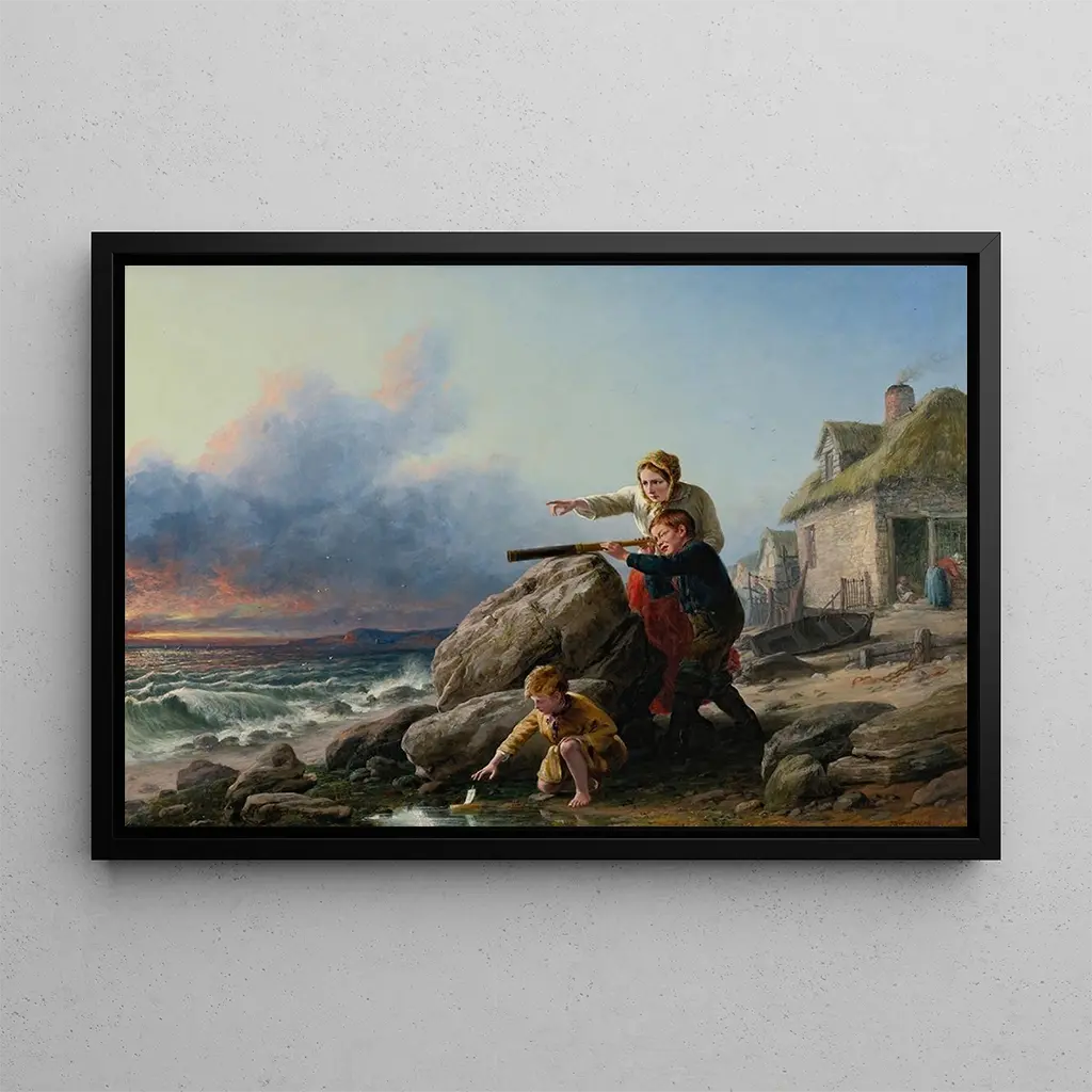 Kunsttrykket På jagt efter skibene af William Bromley dykker ned i en fængslende maritim scene, hvor de hvide sejl på skibene skiller sig ud mod en azurblå himmel. De omhyggelige detaljer og de levende farver gør dette værk levende, næsten håndgribeligt. Refleksionerne på vandet og bølgernes bevægelse tilføjer en dynamisk dimension til kompositionen, hvilket inviterer betragteren til at føle den maritime brise. Dette lærred fremkalder ikke kun skønheden ved navigation, men også harmonien mellem menneske og natur, og indfanger et øjeblik af ro ved vandkanten.