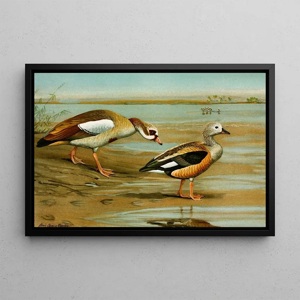 L'œuvre "Oie d'Égypte Oie de l'Orénoque" af Louis Agassiz Fuertes indfanger skønheden og eleganceen af disse majestætiske fugle. Kompositionen fremhæver naturlige farver, nuancer af brun, hvid og sort, der smelter harmonisk sammen i en akvatisk kulisse. Kunstnerens teknik, der kombinerer videnskabelig præcision med kunstnerisk følsomhed, skaber en levende og immersiv atmosfære. Hvert detalje, fra fjerdragt til reflekser på vandet, er omhyggeligt gengivet, hvilket inviterer betragteren til at beundre disse skabningers ynde i deres naturlige habitat.