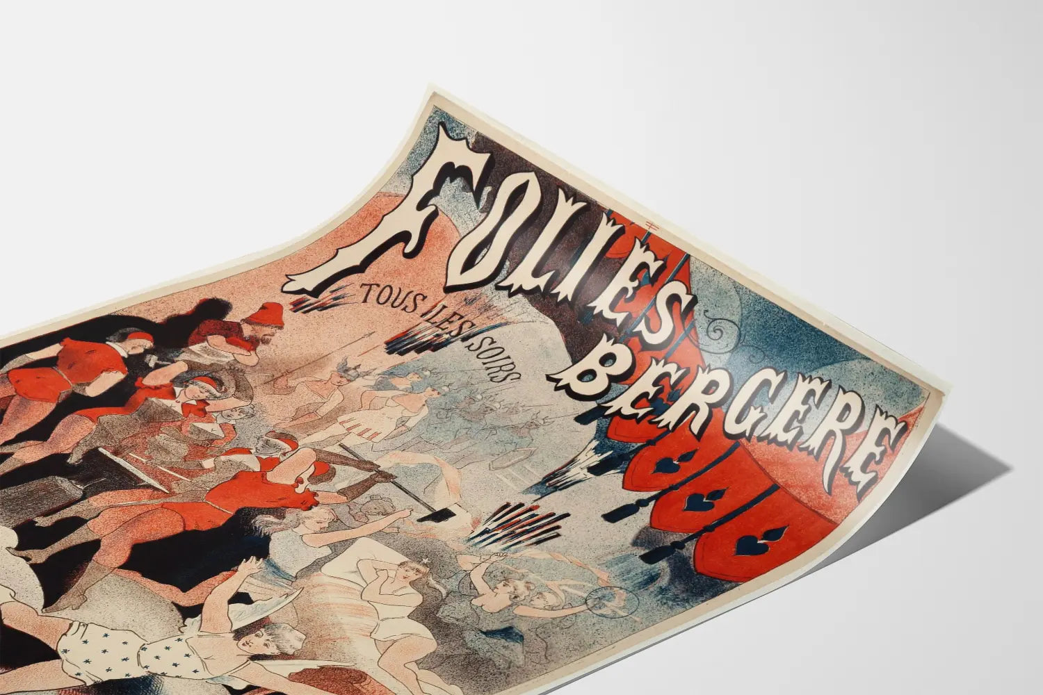 Opdag dette vintage plakat i Art Nouveau-stil, et ikonisk stykke af parisisk kultur, der viser en livlig scene under titlen "Folies Bergère". Denne originale vægdekoration, rig på detaljer, skildrer figurer i kabaretkostumer, der kombinerer dynamik og æstetik med bløde farver domineret af rød, hvid og blå. Plakaten viser en harmonisk balance mellem tekst og illustration, med den stiliserede typografi øverst og nederst på billedet, der fremhæver begivenheden "Mars og Venus underholdning".