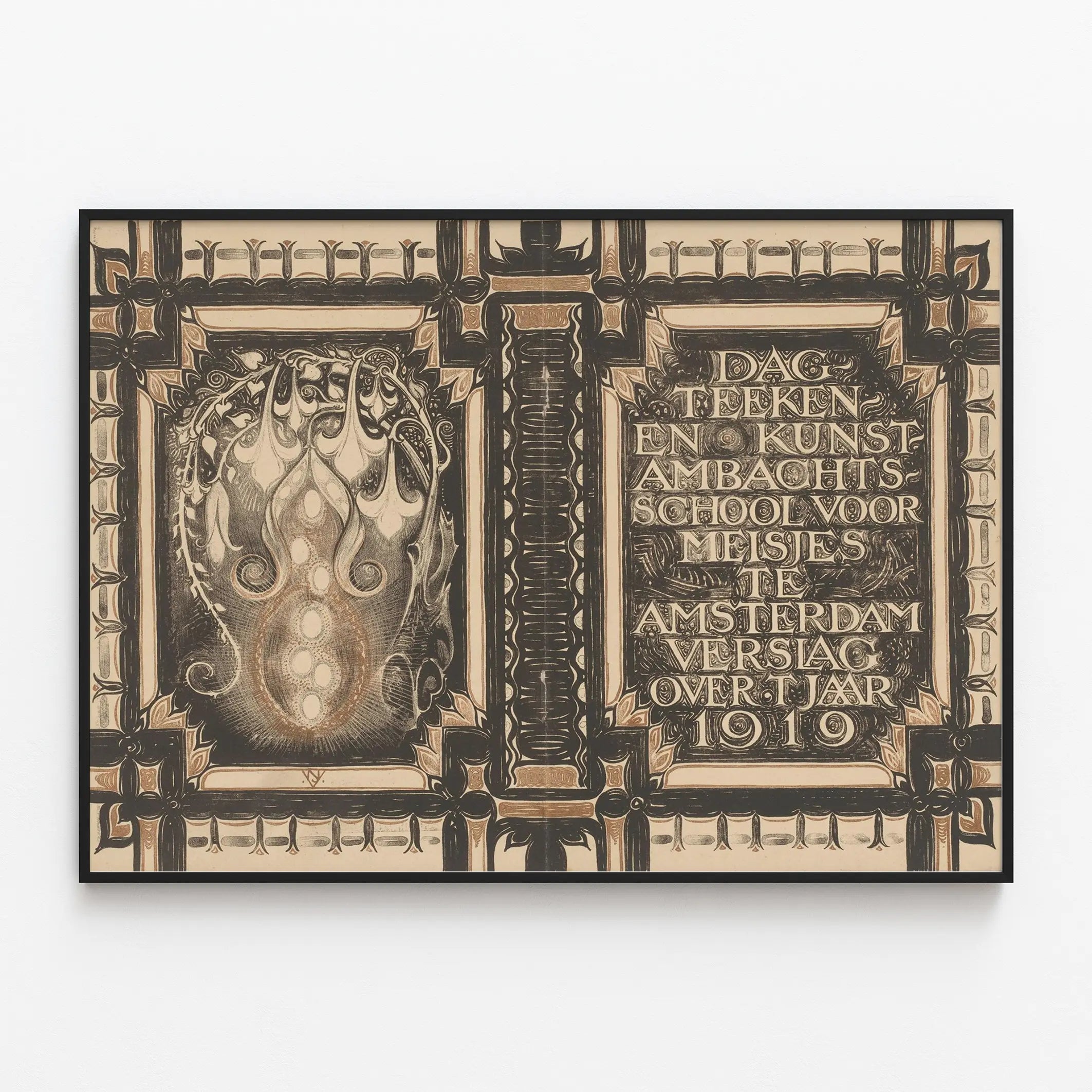 Denne vintageplakat i Art Nouveau-stil præsenterer et sofistikeret og detaljeret dekorativt motiv, typisk for de kunstneriske værker fra begyndelsen af det 20. århundrede. Udført med et subtilt spil af brune og sorte nuancer, illustrerer den et design rigt på svungne ornamenter, stiliserede blomsterformer og geometriske elementer, der omgiver den centrale tekst. Teksten på hollandsk refererer til en kunstskole for unge piger i Amsterdam i 1919 og giver et unikt grafisk vidnesbyrd om denne æra. Dette vægdekorationselement passer perfekt til kunst- og historieentusiaster, der ønsker at klæde deres vægge i en gammel og raffineret æstetik. Uanset om det er i plakat- eller posterformat, vil dette værk tilføre et strejf af vintage-elegance og autenticitet til ethvert rum. Denne dekorative stil, der blander kunstnerisk typografi og naturlige illustrationer, gør også dette til et ideelt objekt til at dekorere et kontor, et kreativt værksted eller et kulturområde. Dette visuelle er en enestående del for samlere eller entusiaster af grafisk kunst, der vidner om en æra, hvor dekorativ kunst fusionerede med typografi i en total harmoni. Sammenfattende udmærker denne gamle plakat sig ved sit udtryksfulde grafiske udtryk og sin æstetiske værdi og tilbyder en vægdekoration, der er særegen og fuld af karakter.