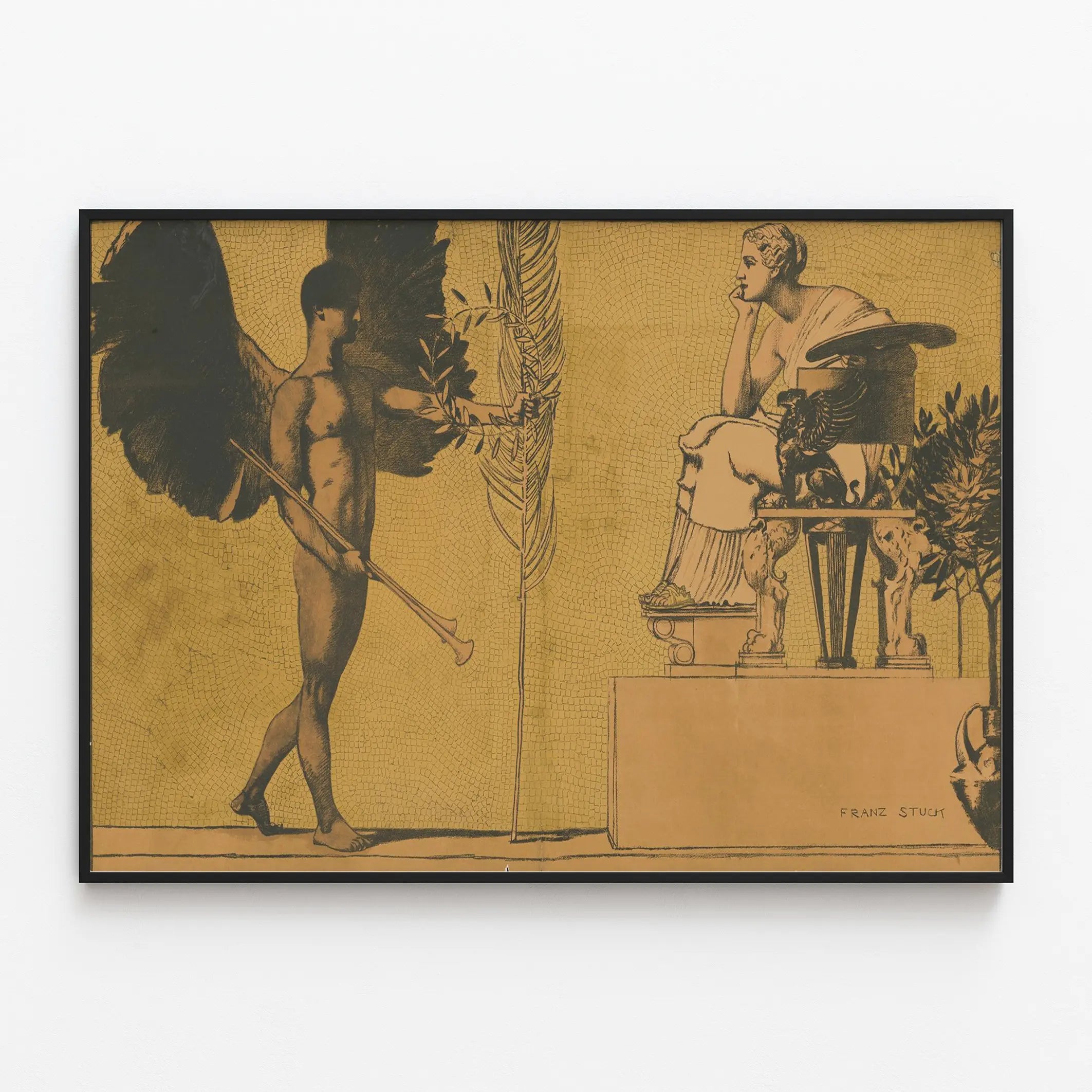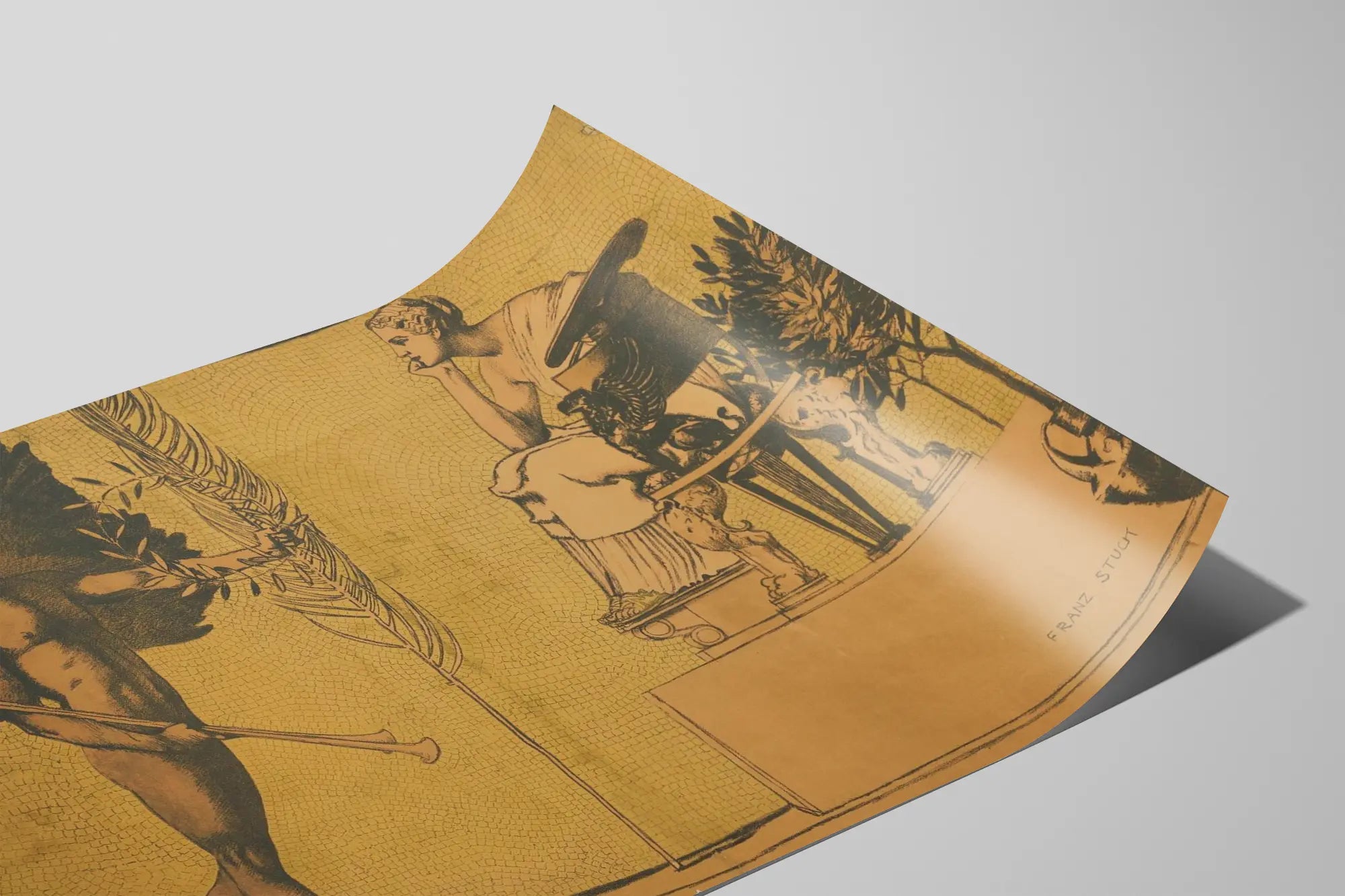 Denne vintage dekorative plakat tilbyder en visuel gengivelse af en årlig kunstudstilling i München, der fremhæver en allegorisk scene inspireret af den klassiske kunst. Plakaten viser en vinget mandlig figur, der holder en trompet og et laurbærkrans, over for en kvindelig figur siddende på en udsmykket trone, i en stil der vækker minde om antik mosaik. Den grafiske komposition bruger sepia-toner og en fin streg, perfekt til at berige en indendørs vægdekoration med en historisk og kunstnerisk atmosfære. Denne vægplakat med omhyggelige detaljer passer harmonisk ind i et rum viet til kunst eller kultur, og bringer et strejf af elegance og dybde. Den henvender sig til elskere af vægdekoration i form af kunstneriske plakater, der værdsætter den traditionelle kunst og samtidig pynter et interiør med enkelhed og raffinement. Denne plakat gengiver et værk signeret Franz Stuck, ideelt for dem der søger et originalt og udtryksfuldt dekorationsstykke. Som vægdekoration lyser den væggene i et kontor, en stue eller et personligt galleri op og skaber en atmosfære af kunstnerisk eftertanke. Dette produkt er et perfekt valg for entusiaster af klassisk kunst og kunsthistorie, der ønsker at berige deres samling med en plakat, der forener æstetik og visuel fortælling.