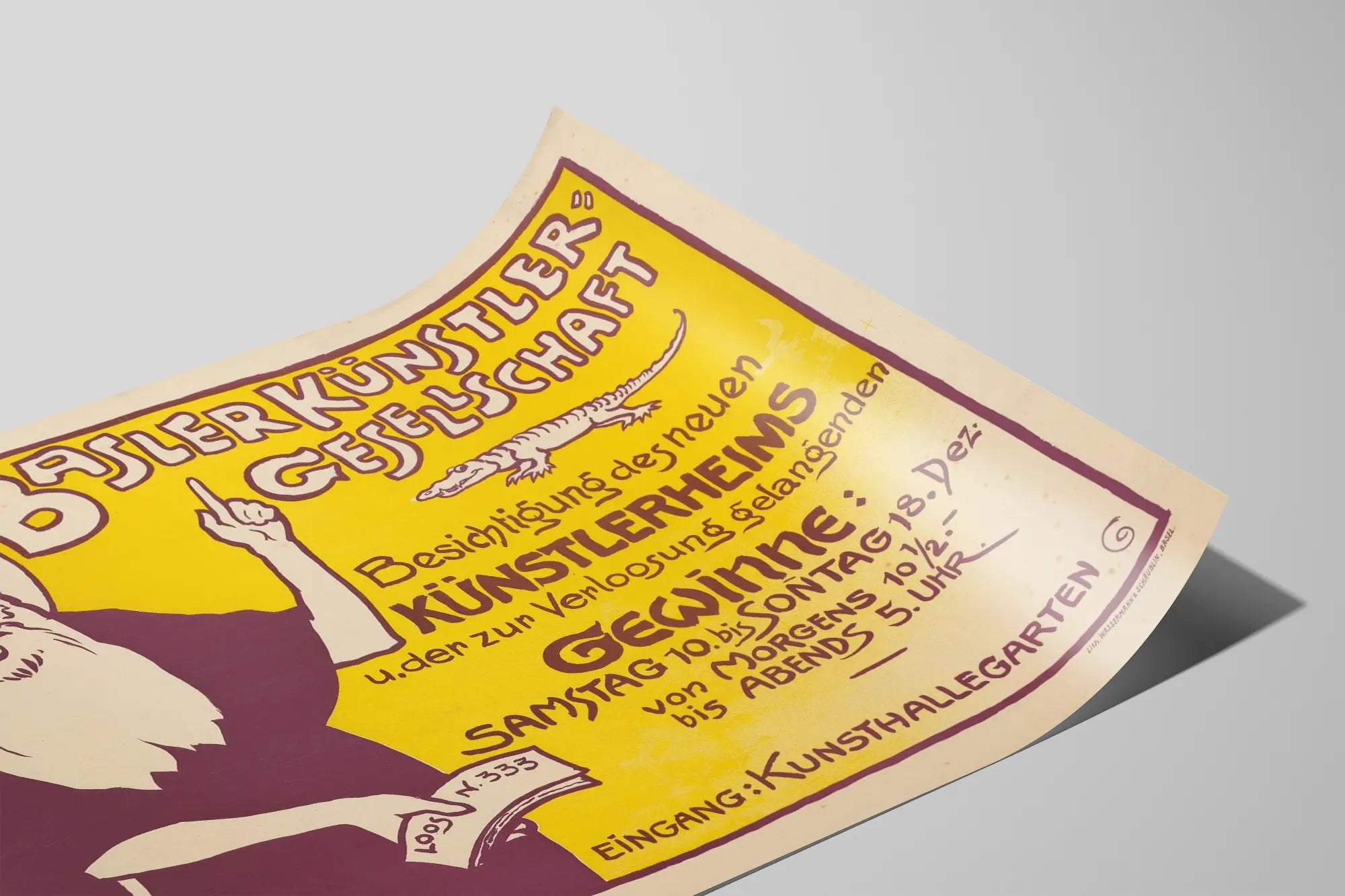 Denne vintageplakat illustrerer med en karakteristisk grafisk stil en begivenhed arrangeret af Basler Künstlergesellschaft, en kunstnerforening i Basel. På en intens gul baggrund viser billedet en karikaturagtig figur med hvid skæg, kaldet Sanctus Lukas, der holder en malerpalle og en nummereret billet. Den tyske tekst annoncerer besøget af det nye Kunstlerheim (kunstnerhjem) samt en lodtrækning om præmier. Plakaten nævner også de præcise datoer for begivenheden, fra lørdag den 10. til søndag den 18. december, samt åbningstiderne, fra morgen til sent på aftenen. Adgangen sker via Kunsthalle-haven. Denne plakat følger en æstetik, der er typisk for udstillings- eller kulturarrangementer fra begyndelsen af det 20. århundrede, og kombinerer naiv grafik med håndskrevet typografi for at fange opmærksomheden. Denne type vægdekoration er særligt egnet for kunst- og grafikkendere, der ønsker at integrere et værk med retro- og udtryksfuld stil i deres indretning. Som kunstnerplakat giver den et farverigt dekorativt præg og et strejf af europæisk kulturhistorie. Uanset om det er til et kontor, en stue eller et privat galleri, tilføjer denne plakat en både historisk og livlig atmosfære, ideel til at fremhæve en væg med en original reference til Basel’s kunstscene fra fortiden.