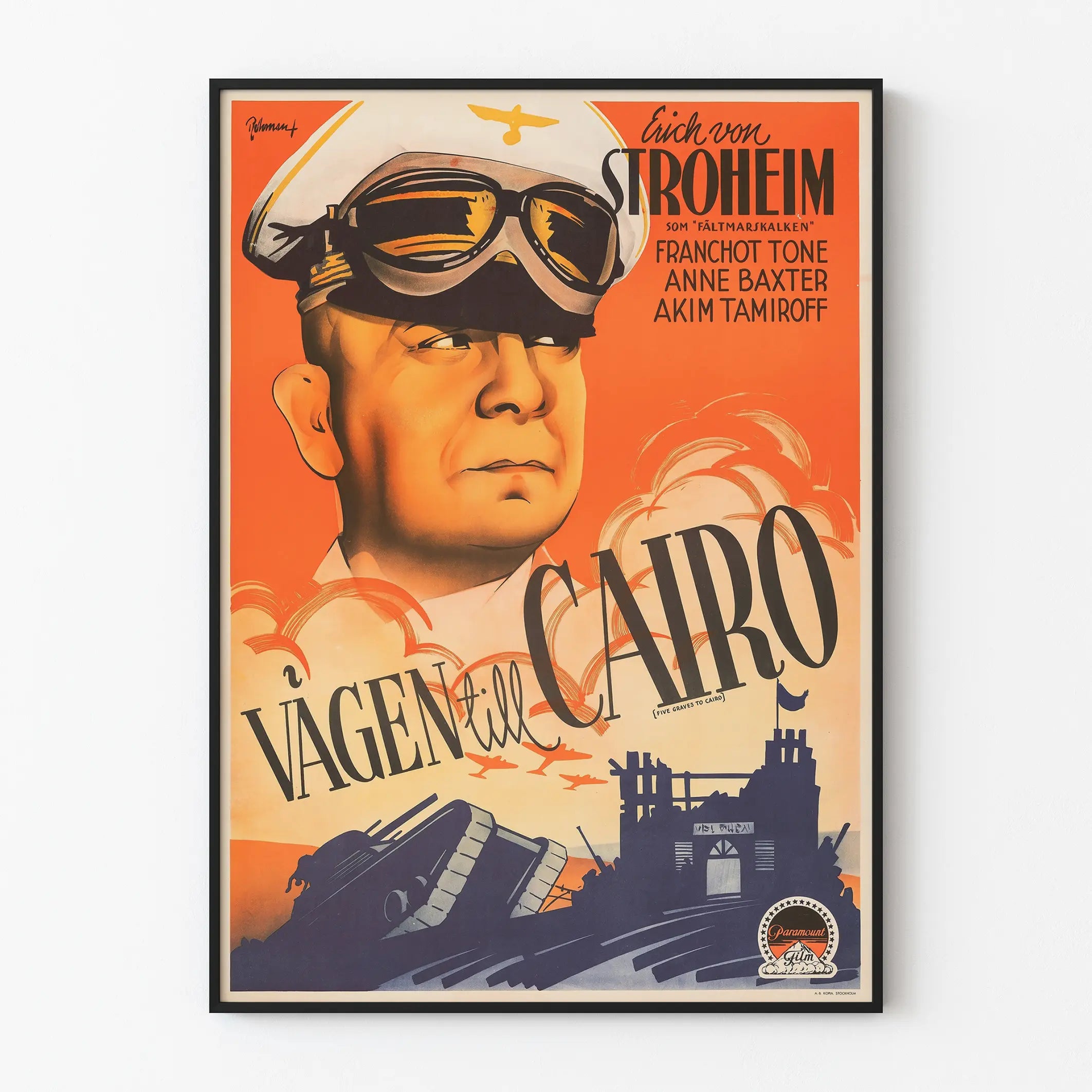 Denne vintage filmplakat med titlen "Vägen til Cairo" er en vægdekoration, der vil tiltale fans af klassisk film og retrokunst. Dominert af en livlig orange baggrund viser den et udtryksfuldt portræt af en mand i uniform med hjelm og pilotbriller, et stærkt symbol, der vækker associationer til militærverdenen og heroisk eventyr. Den grafiske sammensætning afslører flere karakteristiske elementer: en gruppe af tre mørke silhouette-tanke, formation af fly, og ruiner, der antyder en krigssituation. Disse motiver kombineres for at skabe en dybt dramatisk og dynamisk effekt, som kan berige vægdekorationen i stuen, på kontoret eller i et rum dedikeret til film eller militærhistorie.