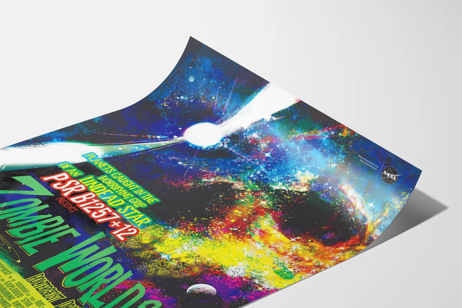Opdag denne vægdekoration plakat inspireret af den fascinerende verden af udenjordiske planeter og rumforskning. Denne farverige plakat med titlen "Zombie Worlds" viser en livlig kunstnerisk gengivelse af planetsystemer omkring en pulsarstjerne, kendt som en "død stjerne" eller "uendelig stjerne". De levende farver og stærke kontraster bringer dette kosmiske billede til live, hvor nuancer af blå, grøn, gul, rød og sort dominerer, hvilket skaber en mystisk og fængslende atmosfære.