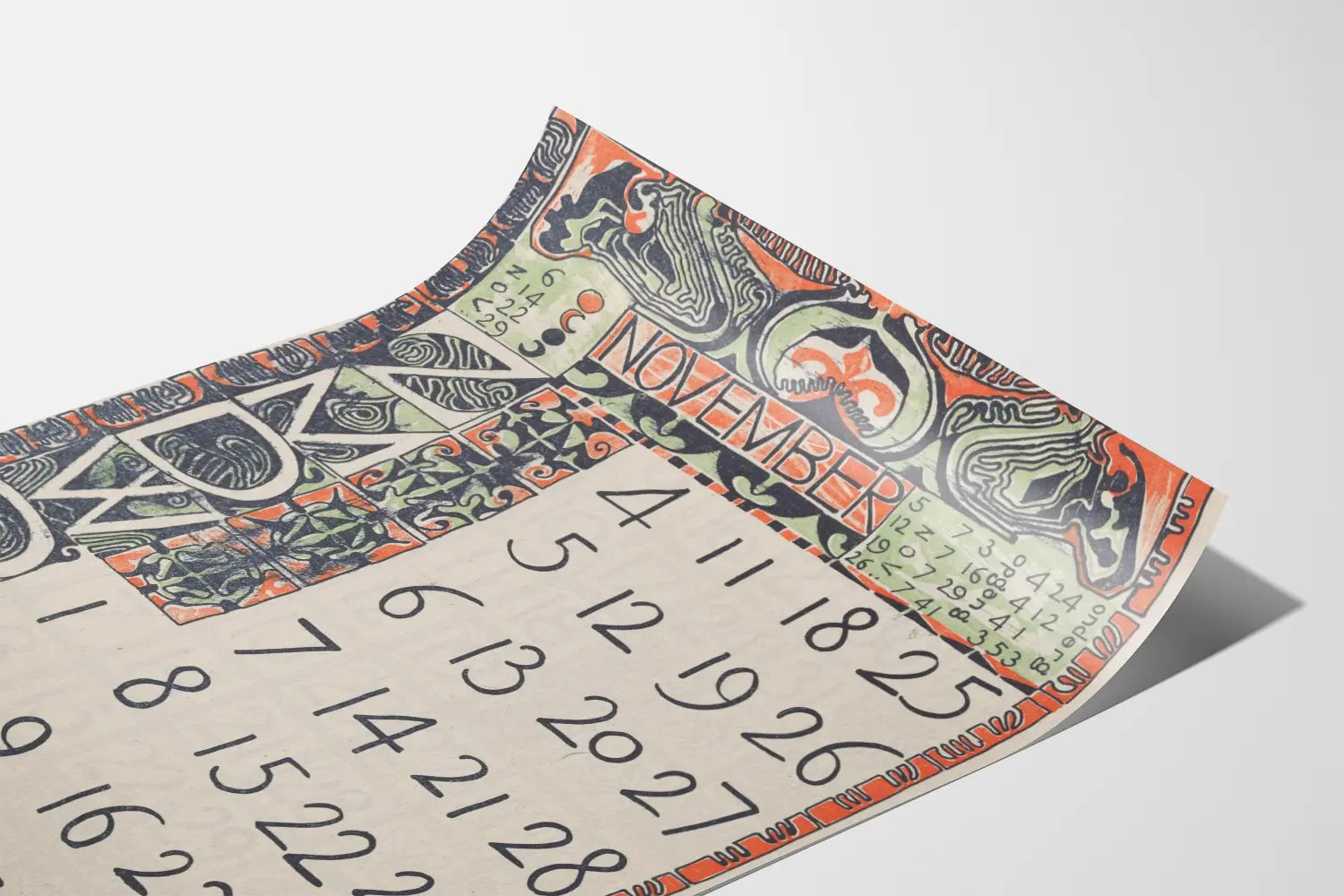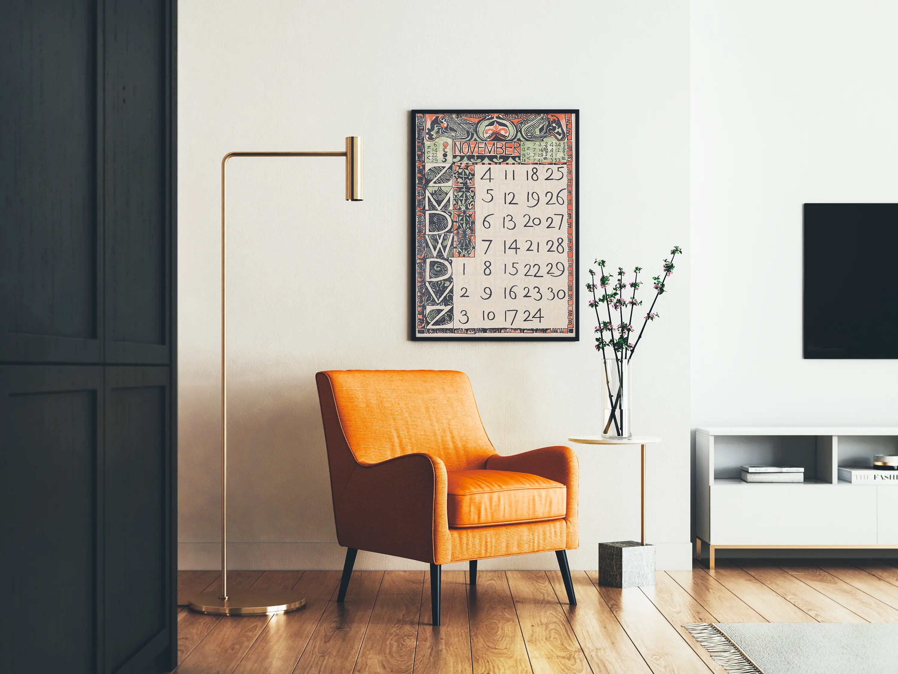 Opdag dette kalenderplakat for måneden november 1900, illustreret i en karakteristisk Art Nouveau-stil med blomstermotiver og elegante kurver. Denne vægdekoration kombinerer et vintage grafik med en klassisk farvepalette, med indslag af grøn, orange og sort, integreret i ornamentale elementer, der harmonisk omgiver kalenderen. Dette plakat viser dagene i november tydeligt og i lige linje, med initialerne for ugedagene skrevet lodret på venstre side i en dekorativ skrifttype. Rammen omkring plakaten er rigt dekoreret og fremkalder en ældre kunstnerisk verden, hvilket gør den ideel som vægdekoration, der tilføjer et retro- og kunstnerisk præg til dit hjem. Perfekt for entusiaster af klassisk design og historiske tryk, blander dette kalenderbillede funktion og æstetik i ét dekorativt element til ophængning. Dette plakatsæt vil være et unikt dekorativt tilbehør til et kontor, et bibliotek eller en stue, samtidig med at det bringer en tidsstemning frem gennem sine komplekse motiver og gamle typografi. Integrer dette plakatsæt i din samling af vintage vægdekorationer for at berige dine vægge med et præg af ægthed og elegance.