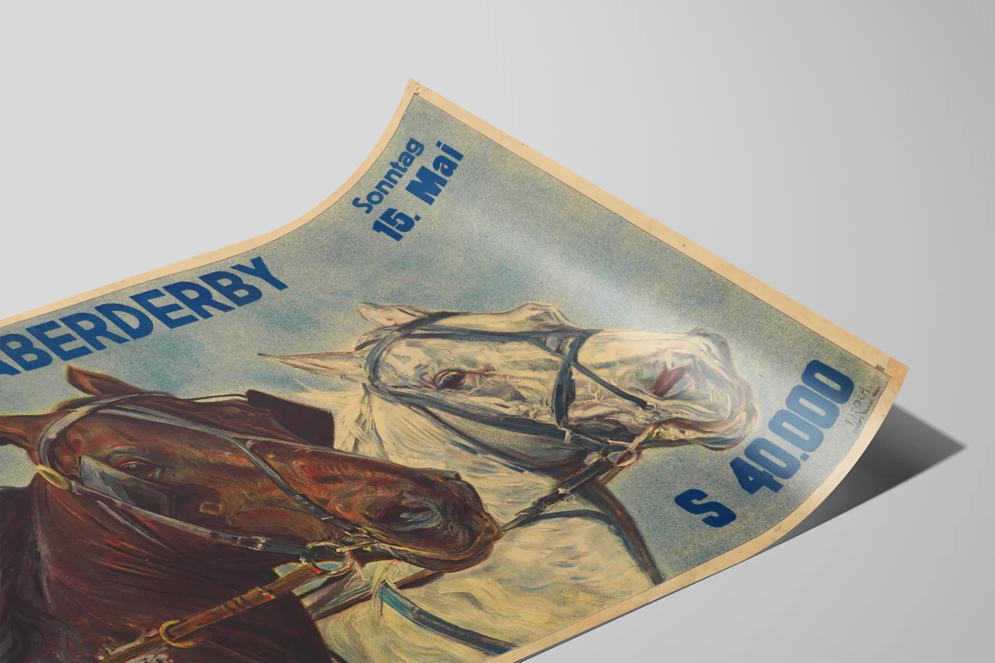 Cette affiche vintage de décoration murale met en scène une course de trot attelé, avec deux chevaux en pleine action. Représentés avec une grande précision artistique, un cheval brun et un cheval blanc sont illustrés de profil contre un fond nuancé de bleu. Les chevaux portent des brides et harnais classiques, annonçant un événement hippique nommé "Öst. Trabderby" qui se déroule un dimanche 15 mai, avec une mention de prix de "S 40.000" en caractères bleus. Cette affiche, au style rétro, s'adresse aux amateurs d'art équestre et de décoration murale authentique. Elle évoque l'univers des courses de trot avec un graphisme typique du début ou milieu du XXe siècle, parfait pour apporter une touche vintage et sportive à vos murs. Ce poster se distingue par ses teintes apaisantes, jouant sur des nuances de bleu pour le ciel et des teintes naturelles pour les chevaux, renforçant son attrait esthétique pour une décoration élégante de salon, bureau ou salle d’attente. Cette œuvre est idéale pour les passionnés d'équitation, les collectionneurs d'affiches anciennes, ou toute personne cherchant un tableau mural original, combinant énergie animalière et finesse picturale. Offrez-vous ou à vos proches cet élément décoratif qui fera sensation grâce à son charme intemporel et son sujet dynamique. Chaque détail de cette affiche est soigneusement rendu, de la texture soyeuse des crins au caractère expressif des regards équins, garantissant un effet visuel saisissant pour sublimer votre décoration intérieure.