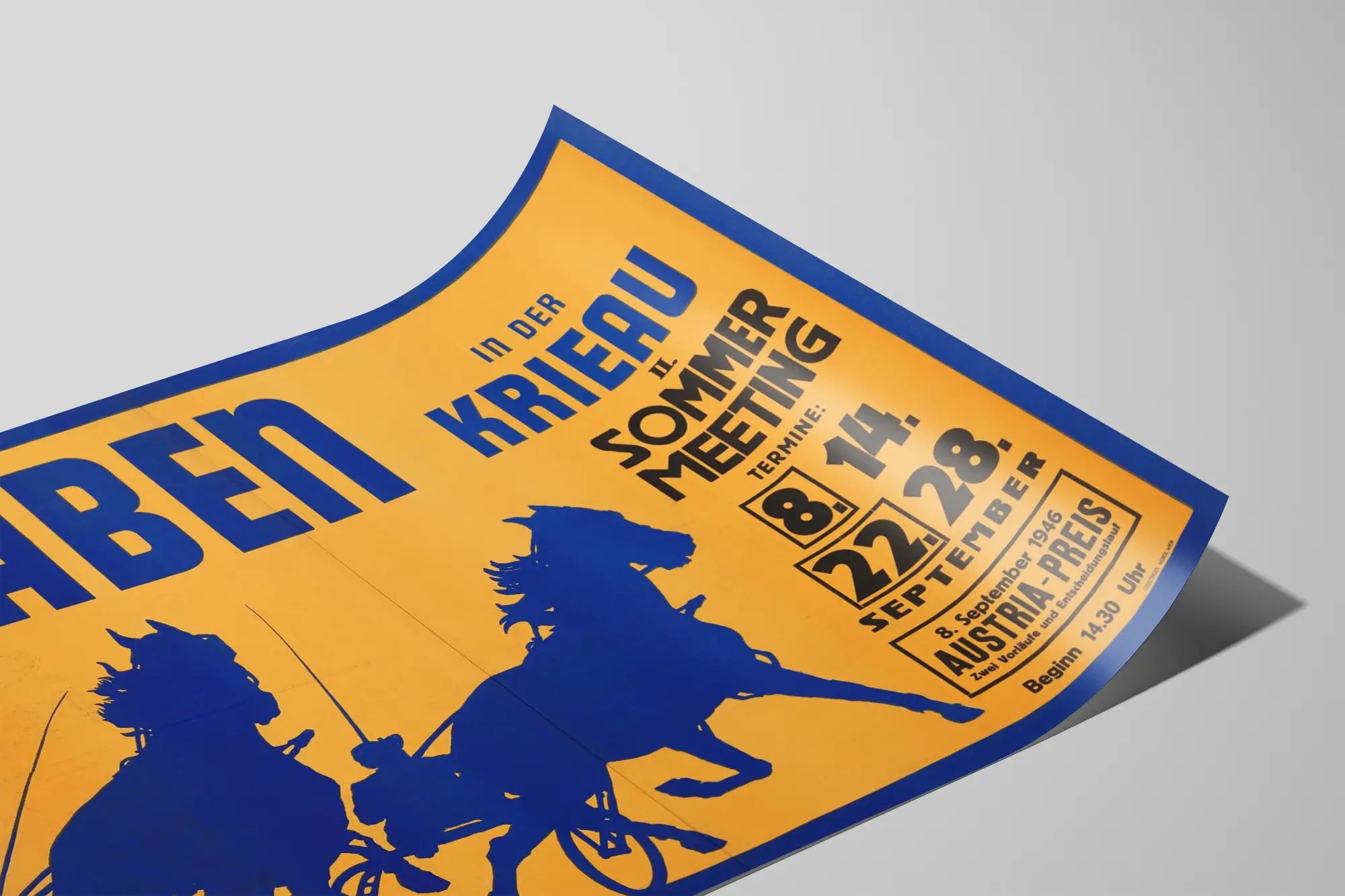 Cette affiche vintage représente une scène dynamique de courses de trot à Krieau, avec deux chevaux attelés et leurs conducteurs silhouettes en bleu sur un fond jaune vif encadré d’un bord bleu. Le texte en lettres majuscules annonce le "II Sommer Meeting" avec plusieurs dates de courses en septembre 1946, dont le 8 septembre pour le "Austria-Preis", attirant les amateurs de courses hippiques. Ce poster au design rétro évoque l'ambiance festive et sportive de l'après-guerre, tout en mettant en valeur le style graphique simple et contrasté typique des affiches publicitaires de cette époque. Il constitue une décoration murale originale pour les passionnés d'équitation, amateurs d'histoire ou collectionneurs d'art graphique. Ce tableau affiche un équilibre visuel fort par ses silhouettes imposantes et le jeu de couleurs tranchées, idéal pour donner du caractère à un intérieur contemporain ou vintage. Offrez à votre mur cette affiche de course au trot en hommage à un événement sportif historique, capable d'apporter une touche authentique et pleine d'énergie à votre espace de vie.