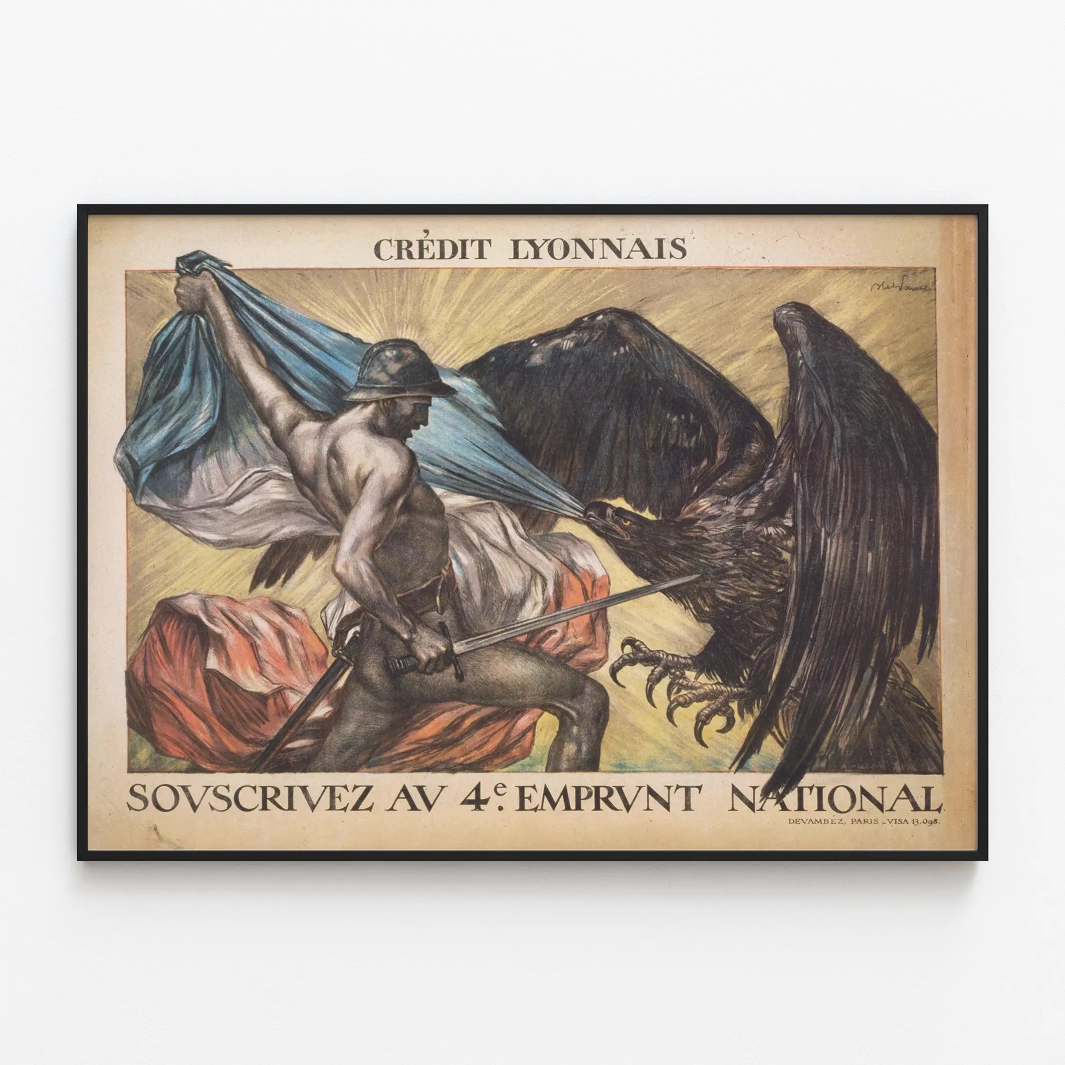 Découvrez cette affiche vintage historique mettant en scène un soldat en armure légère affrontant un aigle noir menaçant, symbole puissant dans la décoration murale d'époque. Cette affiche promotionnelle du Crédit Lyonnais incite à souscrire au 4ᵉ emprunt national, exprimant un message patriotique fort à travers une composition dramatique et un travail artistique minutieux. Cet objet d'art graphique ancien est idéal comme décoration murale pour les amateurs de posters historiques ou pour enrichir un intérieur avec une touche d'authenticité et d'histoire. L'image équilibrée et colorée, dominée par le drapeau tricolore français déployé en arrière-plan, apporte charme et profondeur à ce poster vintage. Ce tableau mural, fidèle à son époque, illustre une scène de confrontation puissante qui capte et retient le regard. Ce poster original est parfait pour une collection de décoration murale ou comme pièce maîtresse dans un espace dédié à l'histoire militaire ou à l'art graphique du début du XXe siècle. Apportez une ambiance unique à votre intérieur avec cette œuvre qui combine esthétisme et portée symbolique, valorisant ainsi le patrimoine visuel à travers un imprimé soigneusement réalisé.