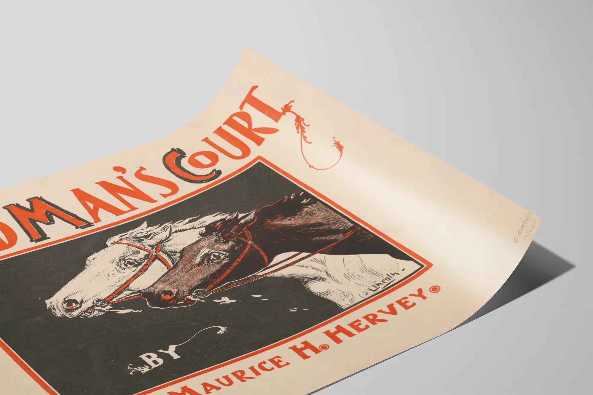 Cette affiche vintage intitulée "Dead Man's Court" est une pièce unique réalisée par Maurice H. Hervey, idéale pour une décoration murale originale et chargée d'histoire. Ce poster présente un dessin dynamique et évocateur de deux têtes de chevaux, l'une blanche et l'autre noire, illustrées dans un cadre sombre qui met en valeur le contraste des couleurs. Le titre, écrit en lettres majuscules rouges avec un style typographique ancien, apporte charme et authenticité à l'ensemble de la composition. En bas à gauche, une représentation graphique intrigante d'un crâne accompagné d'un poignard souligne l'ambiance dramatique et mystérieuse de cet affichage. Cette décoration murale captera l'attention dans un salon, un bureau ou une bibliothèque, apportant une touche de caractère et d'élégance vintage. L'affiche de Maurice H. Hervey s'adresse particulièrement aux amateurs de posters rétro et de graphismes d'époque, souhaitant enrichir leur environnement avec une œuvre qui raconte une histoire à travers son esthétique soignée et ses éléments graphiques puissants. Ce tableau sur papier est parfait pour une collection dédiée à l'art graphique ou comme pièce de décoration à intégrer dans un intérieur alliant tradition et originalité. Grâce à son style graphique unique, cette reproduction murale valorise le patrimoine artistique tout en proposant une ambiance visuelle forte. Elle s'associe facilement avec d'autres éléments décoratifs vintage pour créer un espace harmonieux et singulier.