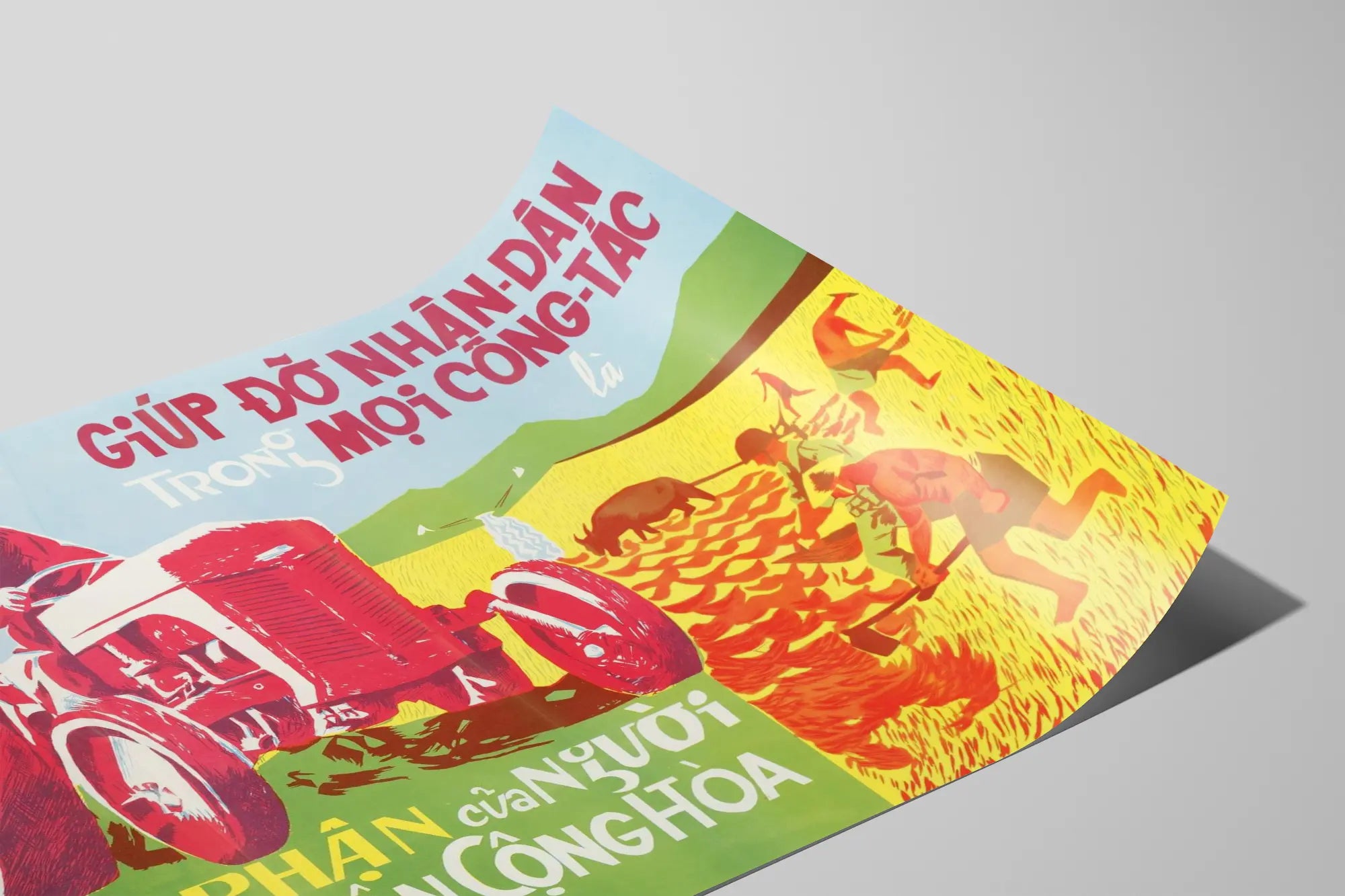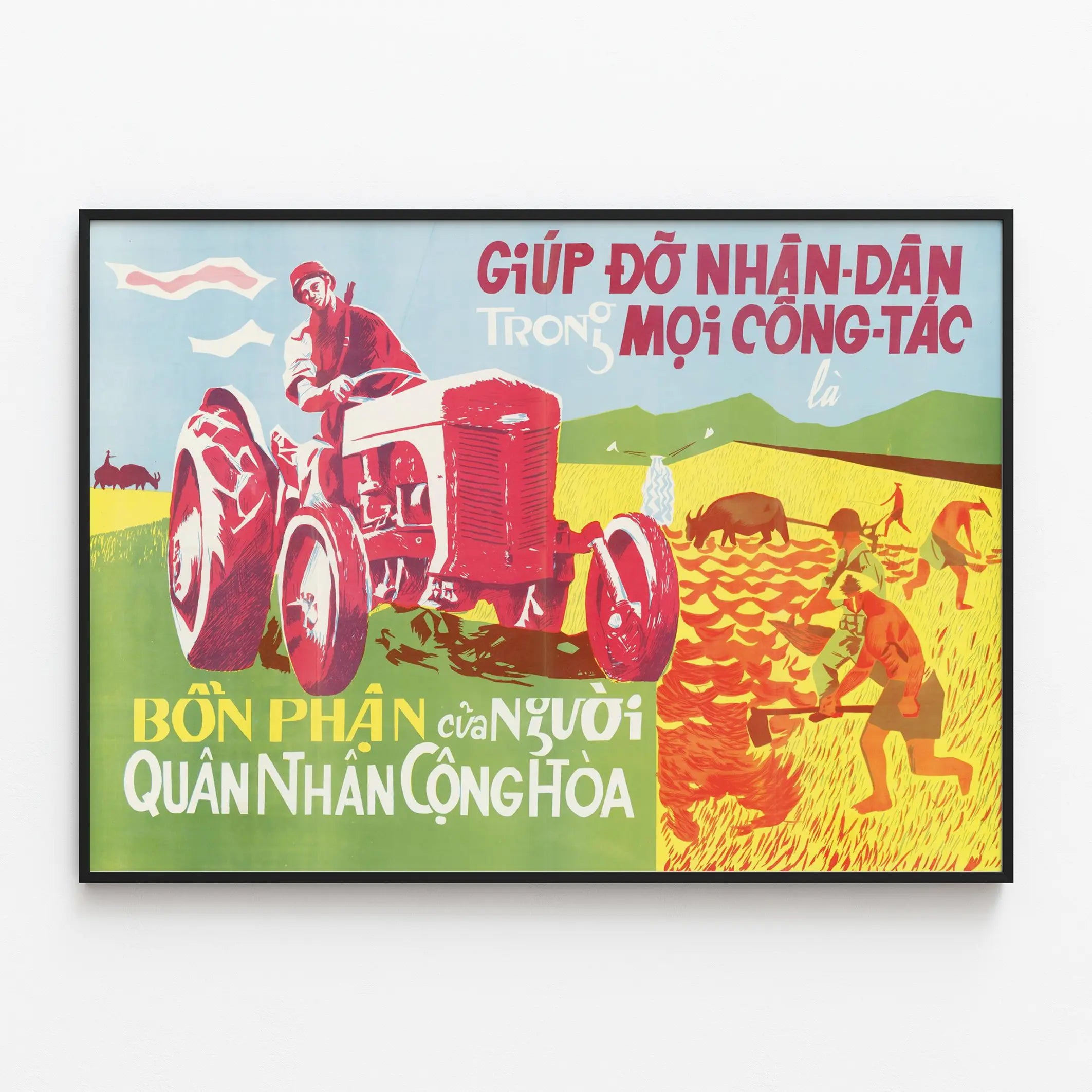 Cette affiche vintage représente une scène champêtre où un soldat à bord d'un tracteur rouge aide à l'agriculture aux côtés de plusieurs travailleurs au champ. Le style graphique est typique des affiches de propagande ou de sensibilisation, avec des couleurs vives telles que le rouge, le jaune et le vert qui dominent la composition. La typographie en caractères vietnamiens accentue le message, mettant en évidence la participation de l'armée dans les activités agricoles, soulignant un engagement collectif dans le travail rural. Cette décoration murale, au ton à la fois historique et culturel, symbolise l'entraide et la solidarité à travers le prisme du soutien militaire aux populations rurales. Parfait comme affiche ou poster, elle apportera une touche authentique et graphique à une pièce dédiée à la décoration murale d'inspiration vintage ou à thème historique. Ce tableau mural stimulera une ambiance à la fois dynamique et engagée, idéale pour les espaces de réception, les bureaux ou les intérieurs où l'on souhaite marier art et mémoire visuelle originale.