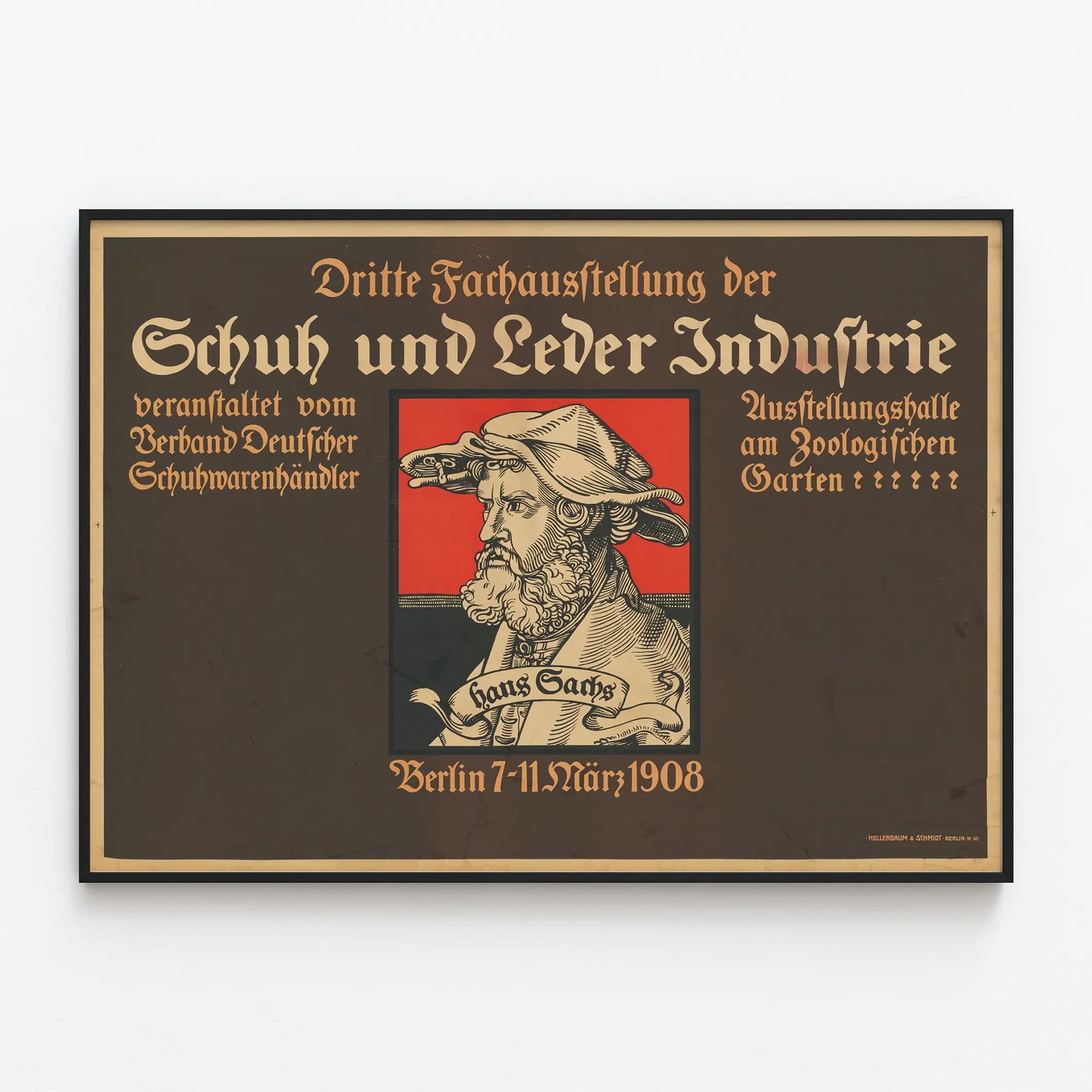 Découvrez cette affiche vintage exceptionnelle dédiée à la troisième exposition spécialisée de l'industrie de la chaussure et du cuir, qui s'est tenue à Berlin du 7 au 11 mars 1908. Cette décoration murale originale offre un regard artistique sur un événement historique, mettant en valeur le savoir-faire et l'importance économique du secteur du cuir et de la chaussure au début du XXe siècle. L'affiche présente une illustration centrale stylisée d'un homme barbu coiffé d'un couvre-chef, avec un fond rouge vif qui attire immédiatement le regard, encadré d'un marron profond, offrant un contraste saisissant. Le texte en typographie gothique exprime toute l'authenticité et le style graphique de l'époque, avec des inscriptions en allemand qui soulignent le thème de l'exposition et son lieu, la salle d'exposition du Jardin zoologique de Berlin. Cette pièce est idéale pour les amateurs de décoration murale vintage, les passionnés d'histoire industrielle ou les collectionneurs d'affiches anciennes. Que ce soit pour un salon, un bureau ou un espace dédié à la culture et au design, ce poster vintage apporte une touche unique et intemporelle. Il met en avant non seulement un aspect du patrimoine industriel allemand, mais aussi un élément de décoration murale à la fois sobre et puissant, qui évoque l'histoire avec élégance. Ce tableau mural, reproduit en haute qualité, saura devenir un point focal dans votre intérieur et enrichir votre décoration avec une ambiance rétro et culturelle. Apportez une atmosphère authentique et riche d'histoire à votre espace avec ce poster vintage d'exposition dédié à l'industrie de la chaussure et du cuir, symbole d'un passé artisanal et industriel valorisé par une mise en image graphique et typographique remarquable.
