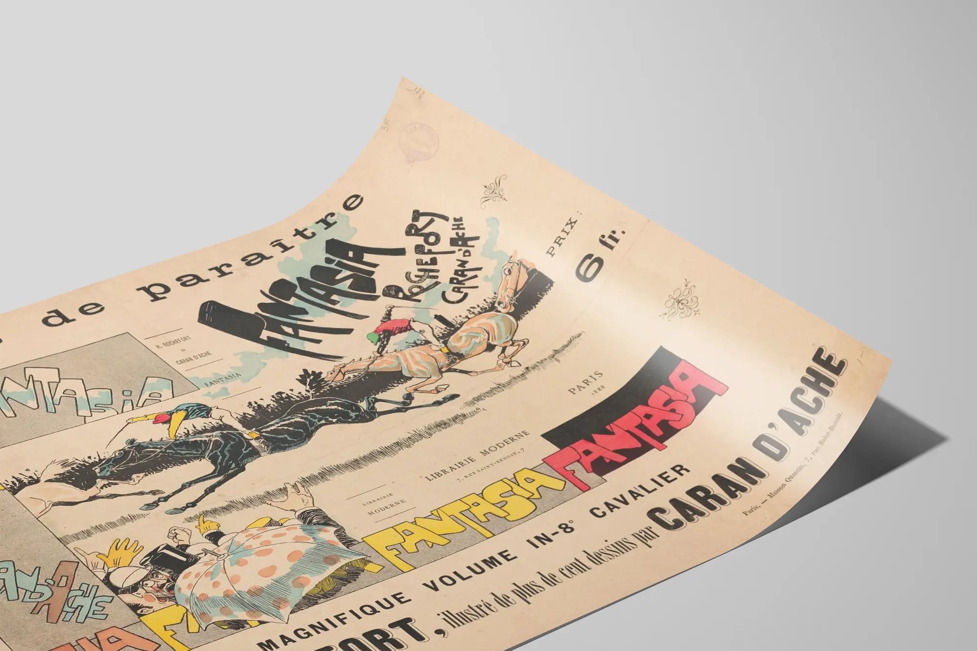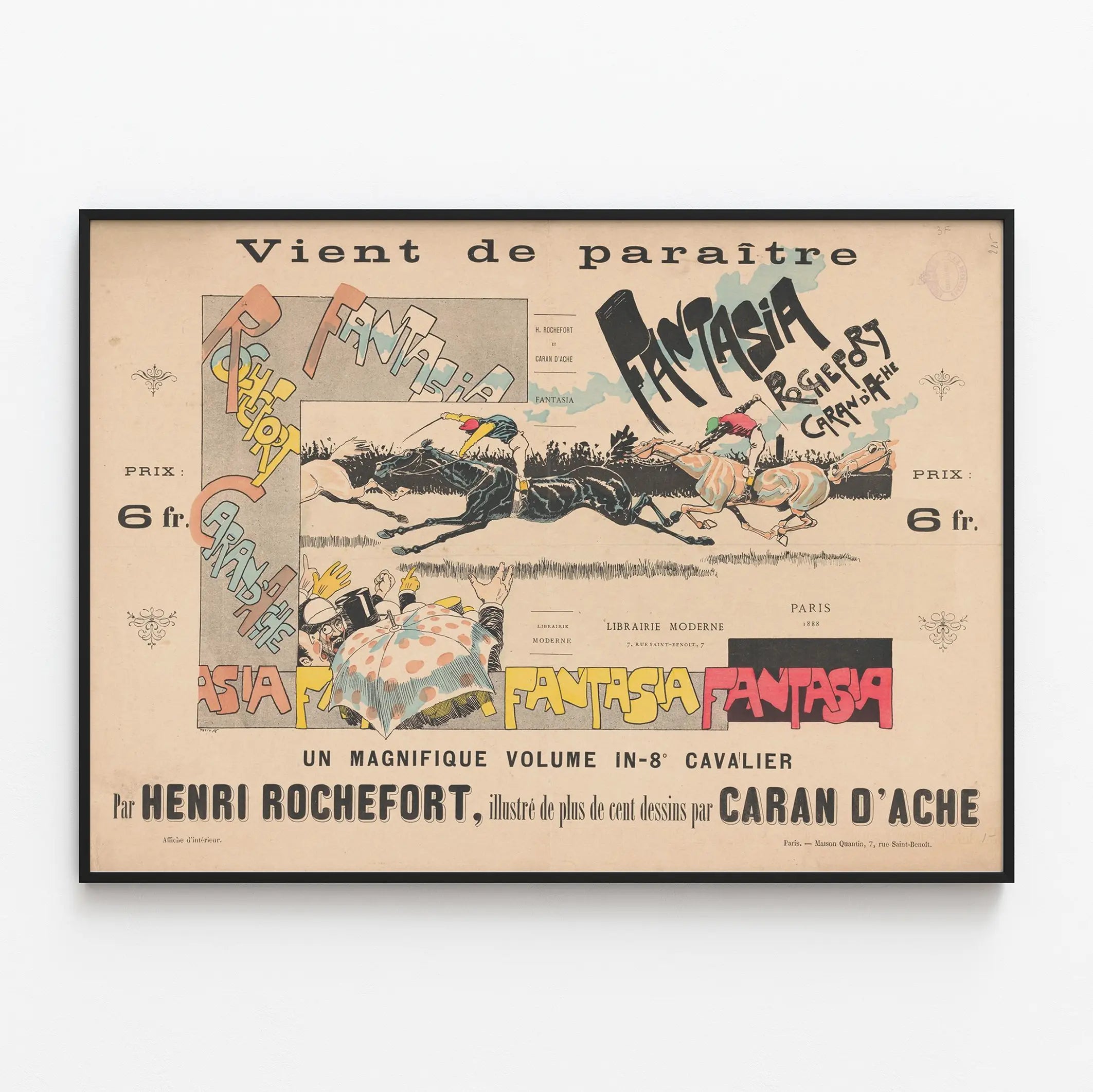 Cette affiche vintage 'Fantasia' est une pièce unique de décoration murale, idéale pour les amateurs d'art graphique et d'histoire. Elle met en scène une course hippique animée où deux jockeys et leurs chevaux sont représentés avec un style illustratif dynamique, mêlant traits précis et touches de couleurs douces. Le texte en grandes lettres colorées et dessinées à la main ajoute une dimension artistique vecteur d'énergie et de mouvement. Cette œuvre, signée par Henri Rochefort et illustrée par Caran d'Ache, propose un mélange original de typographie et d'illustration, en faisant un poster parfait pour une décoration murale vintage et élégante. La composition équilibrée intègre aussi des détails comme une foule enthousiaste et un parapluie à pois, accentuant l'atmosphère festive et animée. Ce tableau en format affiché évoque l'époque avec son choix typographique et sa mise en page traditionnelle. Idéal pour les espaces de vie ou bureaux, ce poster apporte une touche rétro et artistique à votre décoration. Il capture l'esprit de la fin du XIXe siècle avec son style unique et son charme ancien, tout en offrant une lecture facile et esthétique. Une affiche décorative qui s'inscrit parfaitement dans la tendance actuelle du rétro et du vintage, pour donner du caractère à vos murs avec une œuvre d'exception.