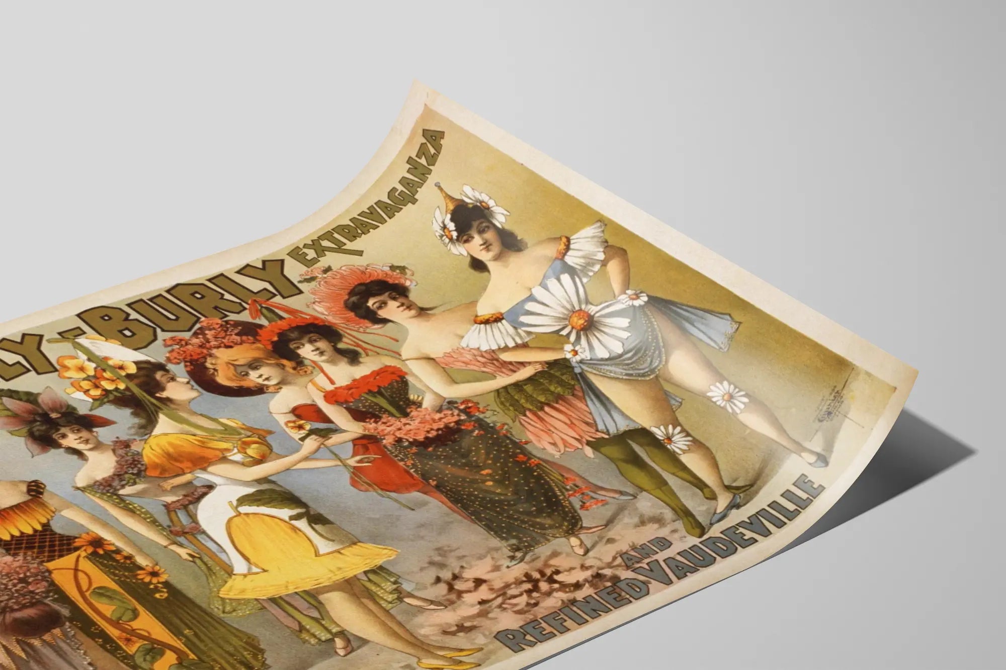 Découvrez cette magnifique affiche vintage intitulée « Hurly Burly Extravaganza and Refined Vaudeville », une véritable pièce de décoration murale qui captera tous les regards. Ce poster présente un groupe de huit femmes élégamment costumées, chacune arborant une tenue colorée et originale inspirée par les fleurs, soulignant un style théâtral typique du vaudeville. Les costumes variés, tout en finesse et en détails, apportent une touche artistique et rétro qui embellira efficacement tout intérieur. Cette affiche murale au charme d'antan est parfaite pour habiller un mur avec sophistication, en apportant une ambiance de spectacle et de fantaisie chic. L'harmonie des couleurs, allant des tons chauds orangés et rouges aux nuances délicates de bleu et vert, ajoute un effet visuel équilibré et plaisant. Ce tableau décoratif renforce l'atmosphère vintage tout en mettant en avant l'esthétique théâtrale et festive d'une extravaganza vaudeville. Idéal pour être encadré et mis en valeur dans un salon, un bureau ou un espace créatif, cet élément de décoration murale vintage invite au voyage dans le temps et à la célébration des arts de la scène. Donnez à votre intérieur une personnalité originale et raffinée avec ce poster unique, synthèse parfaite entre spectacle, élégance et tradition artistique.
