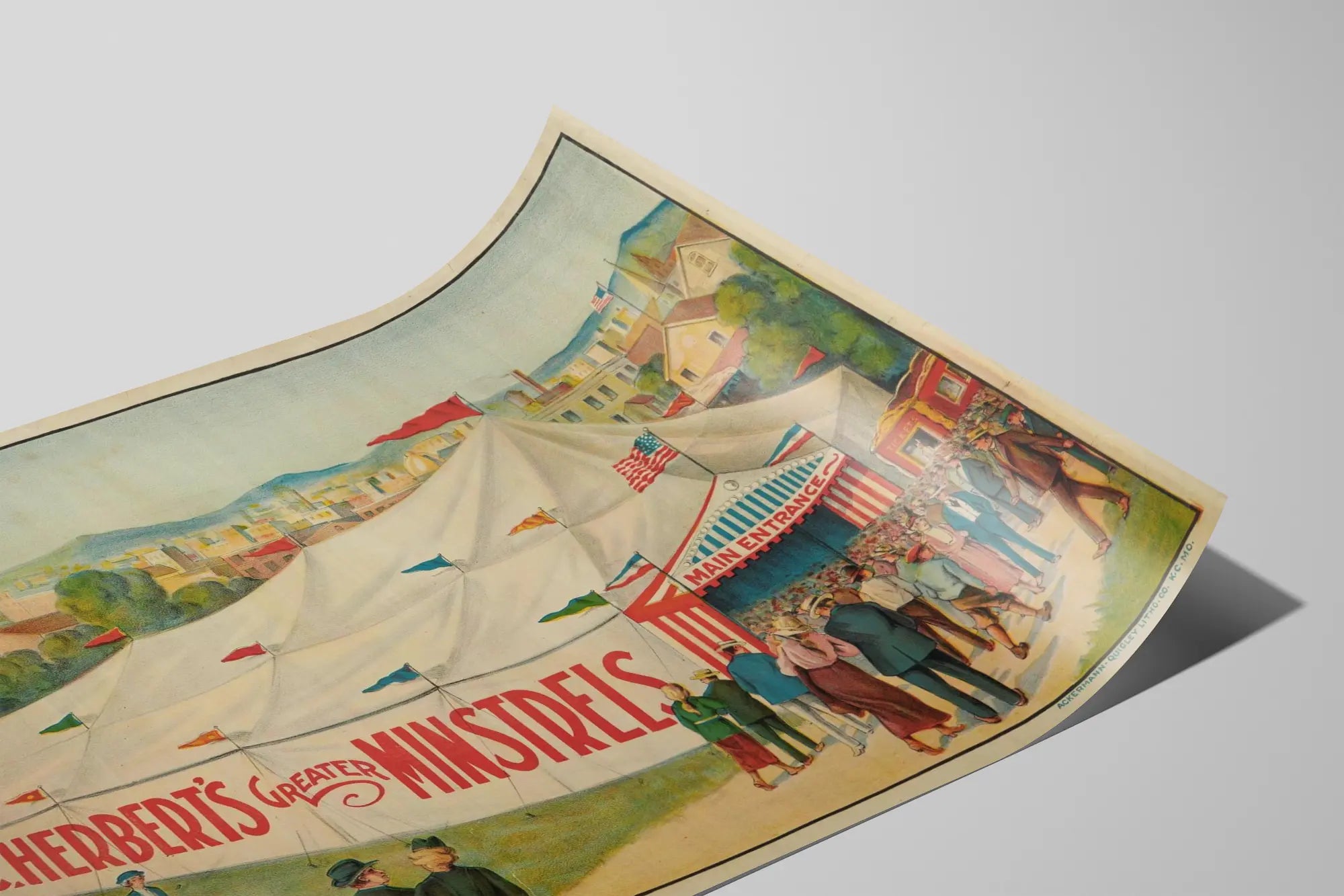 Cette affiche vintage représente une scène animée devant un grand chapiteau de cirque blanc orné de drapeaux colorés et portant en lettres rouges le nom "Jos. C. Herbert's Greater Minstrels". L'illustration montre une foule élégamment habillée de personnages masculins et féminins en vêtements d'époque se dirigeant vers l'entrée principale du chapiteau où se pressent déjà de nombreux visiteurs. Sur la gauche, une foule plus rare est en marche, ajoutant du mouvement et de la vie à cette scène festive. En haut à gauche, un portrait en médaillon rouge présente un homme nommé Jos. C. Herbert, suggérant qu'il est la figure centrale ou le promoteur de ce spectacle. En arrière-plan, on aperçoit une ville paisible, avec des bâtiments, des arbres et des montagnes lointaines, renforçant l'ambiance typique d'un événement itinérant dans un cadre urbain ou semi-urbain. Cette décoration murale sous forme de poster ou d'affiche vintage est idéale pour les passionnés d'art décoratif rétro, les collectionneurs d'affiches anciennes ou ceux qui souhaitent apporter une touche d'élégance et d'histoire à leur intérieur. Son style coloré et détaillé évoque une époque révolue où les spectacles itinérants et les minstrels étaient un divertissement majeur, apportant une ambiance nostalgique et charmante à tout espace mural. Parfait pour une décoration murale dans un salon, une salle de jeux, un bureau ou un espace culturel, ce poster unique invite à la découverte d'événements populaires du passé et à l'appréciation du graphisme vintage. Son format large et son illustration soignée en font également un élément décoratif remarquable. L'achat de cette affiche peut enrichir une collection d'art mural vintage tout en offrant un point focal captivant dans une pièce, où l'histoire et le design se rencontrent. Optez pour une décoration murale originale avec cette affiche Jos. C. Herbert's Greater Minstrels, parfaite pour apporter caractère et authenticité à votre aménagement intérieur.