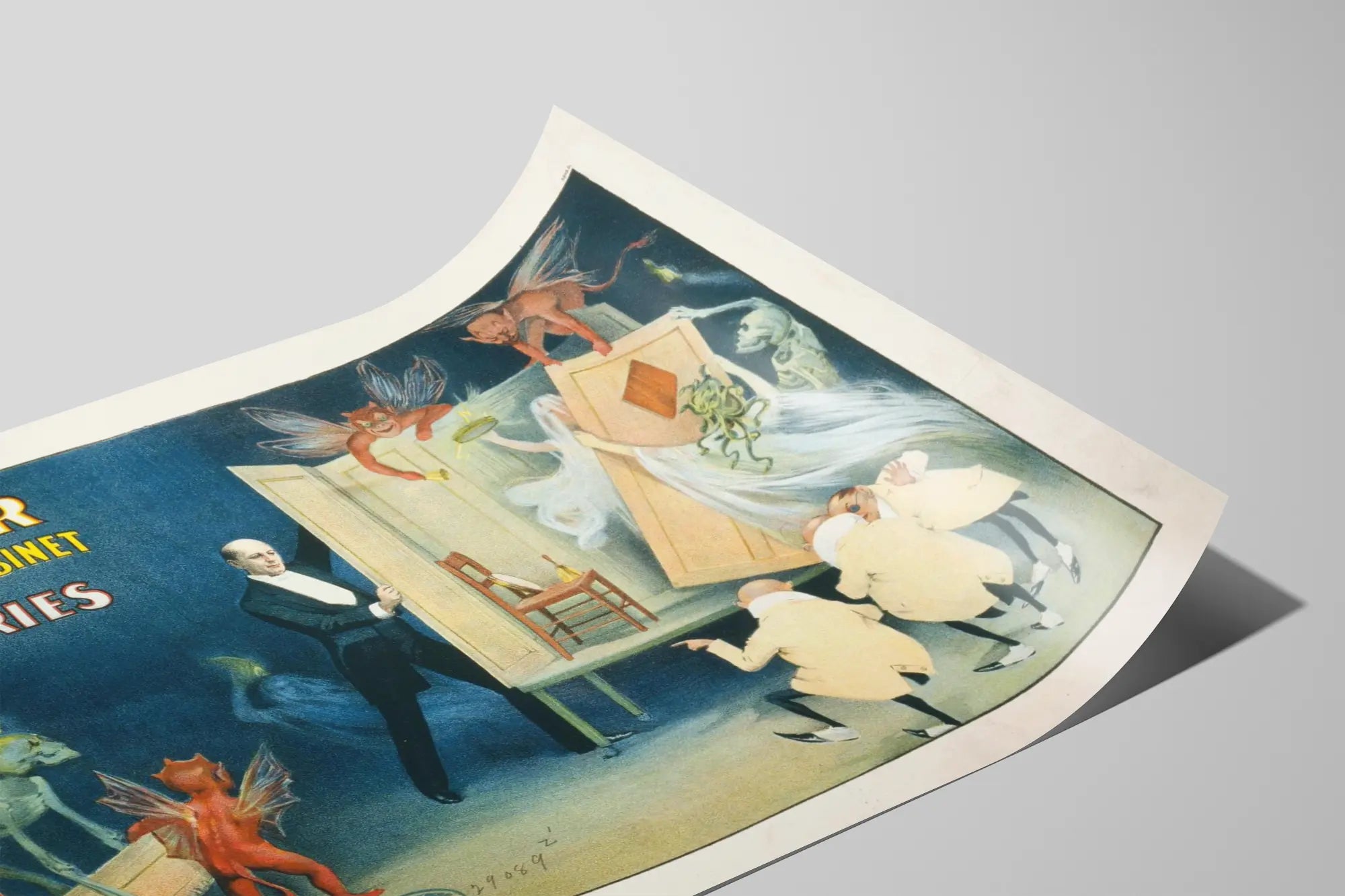 Cette affiche vintage intitulée "Kellar and His Perplexing Cabinet Mysteries" capture l'essence fascinante de la magie et du mystère. Représentant un magicien ouvrant un cabinet d'où émergent des créatures fantastiques et spectres, cette décoration murale est parfaite pour les amateurs de magie, de spectacles et d'art rétro. L'image met en scène un homme en costume formel, au centre de l'attention, dévoilant une scène étrange et énigmatique où des petits démons ailés, un squelette et des fantômes prennent vie, insufflant une atmosphère étrange et captivante. Les couleurs profondes dominent la composition, avec un fond sombre contrastant avec les figures lumineuses et détaillées. Ce poster combine l'art classique de l'illustration avec un style théâtral qui attire inévitablement le regard et stimule l'imagination. Intégrer cette affiche dans votre décoration murale apportera une touche d'originalité et d'histoire, idéale pour un salon, un bureau ou un espace dédié à la magie et aux curiosités. Ce tableau d'illustration est un choix unique pour ceux qui souhaitent offrir une ambiance mystérieuse et énigmatique à leur intérieur, tout en valorisant un style artistique vintage incontournable.