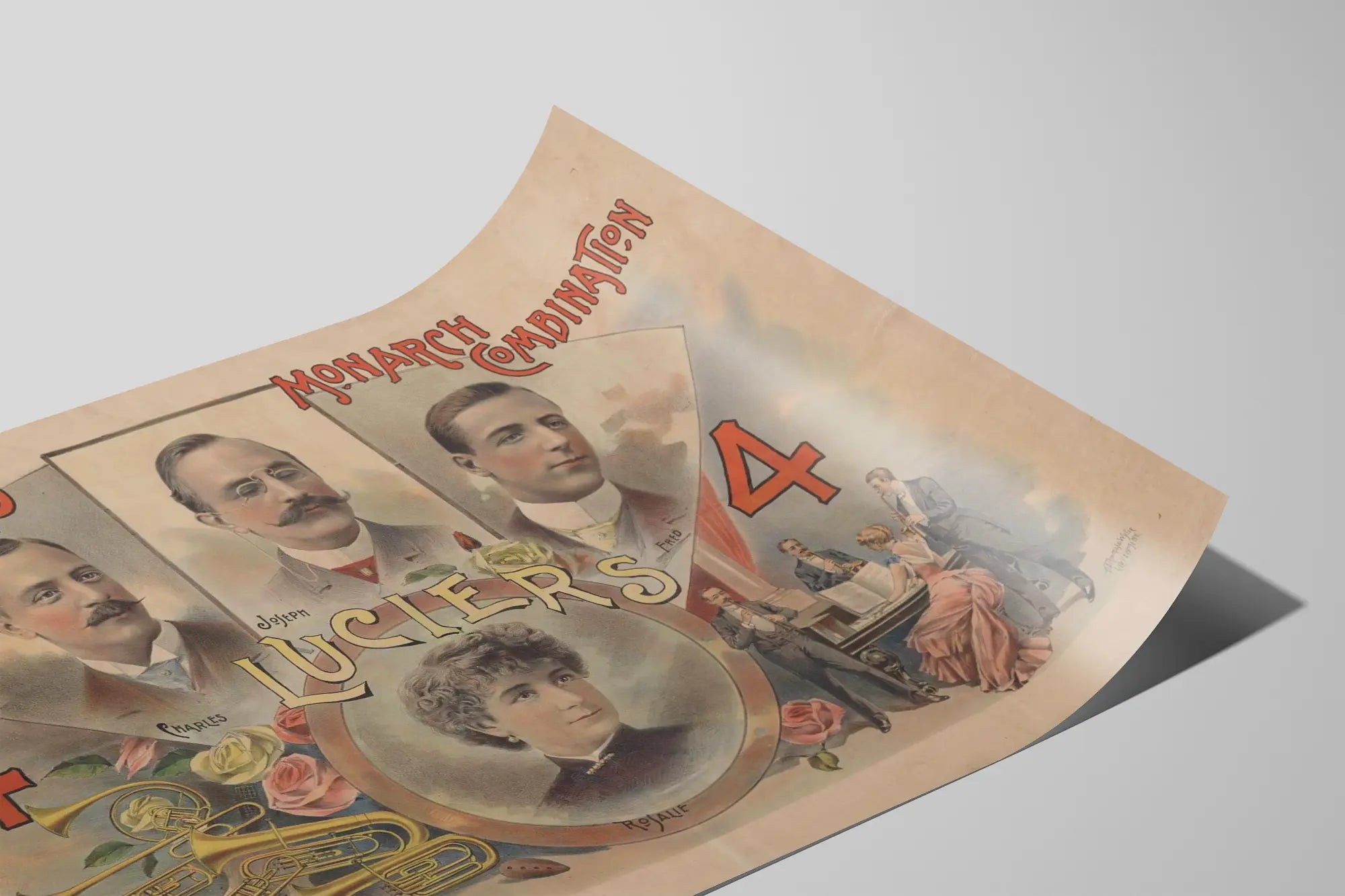 Cette affiche vintage de style rétro met en avant le groupe Kernell's Monarch Combination, surnommé "Luciers - Monarchs of the Musical World". Elle présente quatre portraits masculins et un portrait féminin au centre, chacun avec une allure élégante de l'époque, coiffures soignées et costumes anciens. Les noms Charles, Joseph, Fred et Rosalie sont clairement associés aux visages, soulignant leur rôle au sein de ce groupe musical historique. Ce poster est enrichi d'une illustration d'instruments à vents dorés tels que trompettes et trombones, rassemblés à gauche de la composition, évoquant l'univers musical du groupe. À droite, une scène de musique d'ensemble se déroule avec des musiciens jouant du piano et d'instruments à vent, dans une ambiance de soirée intime et artistique. L'ensemble de la décoration murale joue avec des tons sépia et des touches de couleur subtile, apportant un charme ancien et chaleureux. L'affiche s'inscrit parfaitement dans une décoration murale thématique autour de la musique et de la nostalgie des orchestres classiques. Que vous soyez amateur de décoration vintage ou de posters musicaux élégants, cette reproduction apportera une touche d'authenticité et de raffinement à votre intérieur. Ce tableau mural unique est idéal pour embellir un salon, un bureau ou une salle de musique, rappelant l'âge d'or des ensembles musicaux combinés. Sa typographie travaillée et ses portraits raffinés font de cette affiche une pièce artistique décorative qui captive le regard et stimule l'imaginaire. Intégrer cette affiche dans votre décoration, c'est choisir un élément décoratif chargé d'histoire et d'ambiance, parfait pour créer une atmosphère conviviale et esthétique.