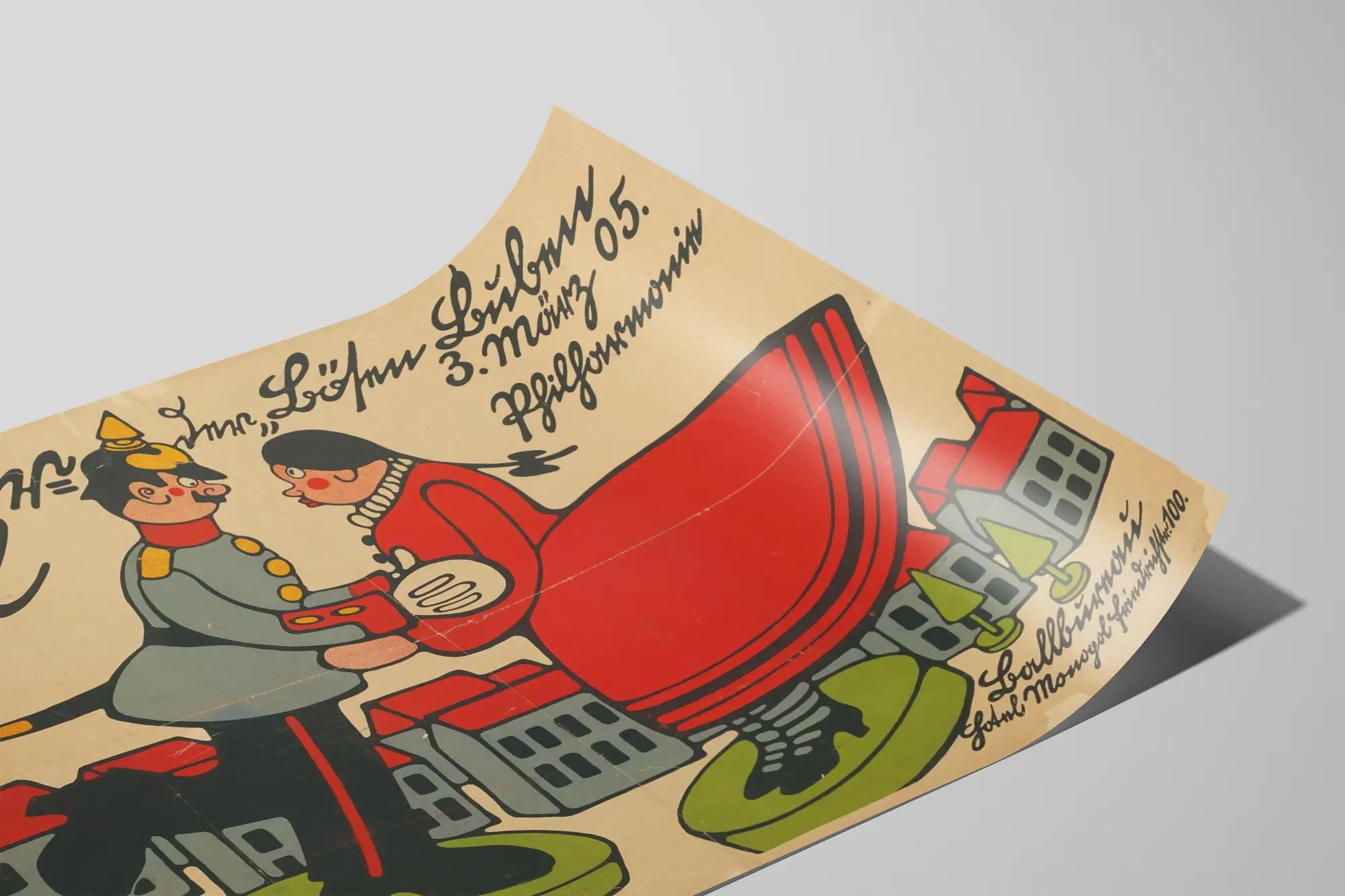 Cette affiche vintage intitulée "Kinderball Der Bosen Buben" représente une scène artistique et colorée qui rappelle le style graphique du début du XXe siècle. On y distingue un couple figuré de manière stylisée et caricaturale : un homme en uniforme militaire gris avec des détails rouges et or, et une femme en robe rouge à col blanc. La posture des deux personnages, se tenant par les mains dans une position de danse, suggère une ambiance festive ou un événement social convivial. Le fond est composé d’un paysage urbain simplifié avec des maisons aux toits rouges et des arbres verts, évoquant un cadre germanique. L’écriture manuscrite en allemand, présente sur l’affiche, ajoute une touche authentique et ancienne, renforçant le cachet rétro de ce poster. Parfait pour une décoration murale, ce tableau imprimé au style graphique naïf et expressif apportera une touche d’originalité et de charme ancien à votre intérieur. Ce poster incarne une esthétique artistique d’époque, idéale pour les amateurs de décoration vintage et ceux qui souhaitent créer une ambiance chaleureuse et culturelle dans leur espace de vie. Ce type d’affiche est un choix décoratif qui s’adapte aussi bien aux salons, bureaux, ou espaces créatifs, en insufflant une note d’histoire et d’art populaire à vos murs.