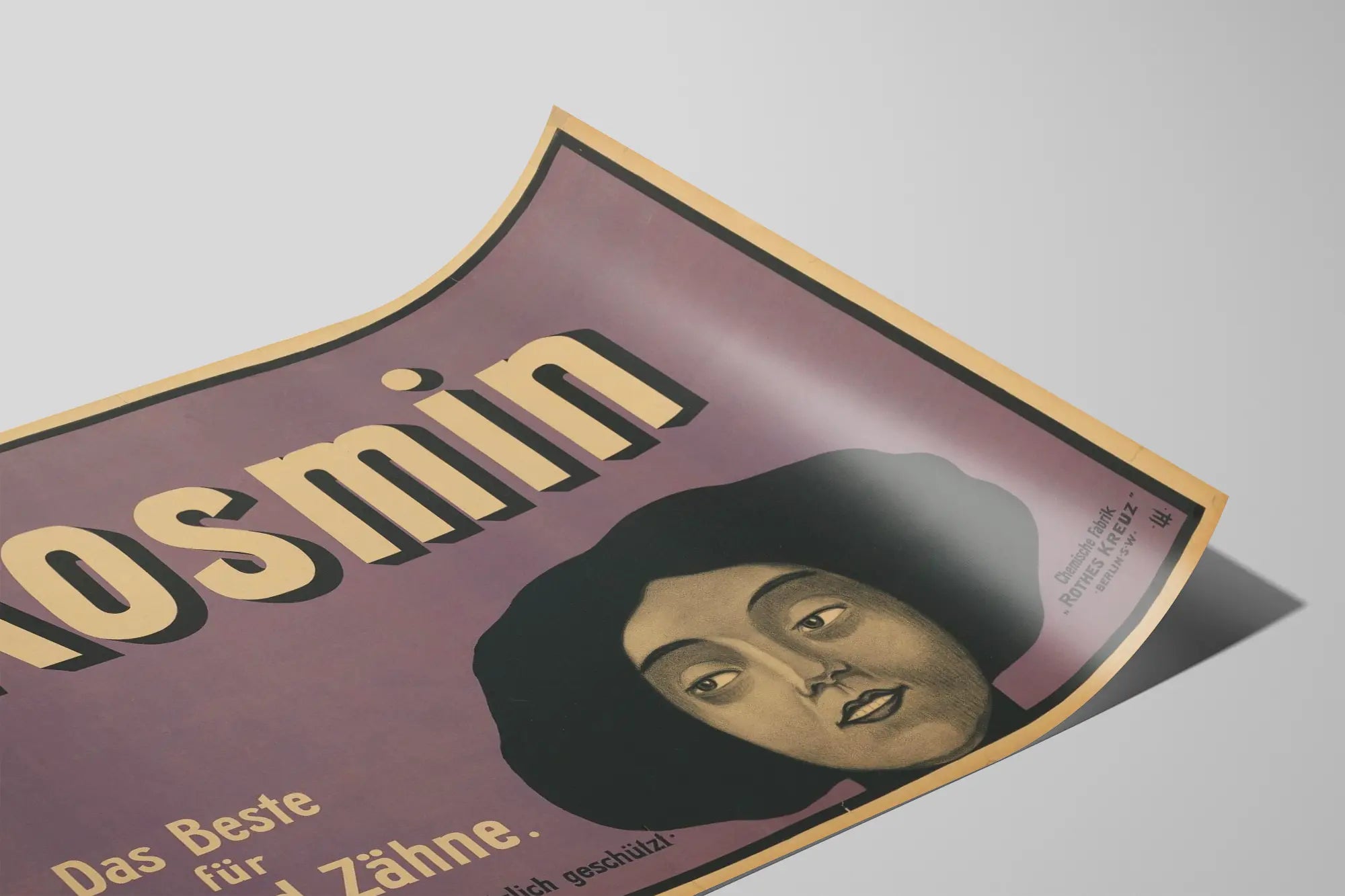 Cette affiche Kosmin est une pièce unique de décoration murale vintage qui attire l'œil par son style graphique typique des affiches publicitaires anciennes. Dominée par une teinte violette en arrière-plan, elle met en avant un portrait féminin au trait détaillé, avec une expression douce et un regard vers la droite, créant une atmosphère rétro et artistique. Le texte principal, écrit en allemand, présente la marque Kosmin en lettres imposantes, suivi du slogan « Das Beste für Mund und Zähne » ce qui signifie « Le meilleur pour la bouche et les dents ». Ce poster publicitaire évoque clairement un produit de soin bucco-dentaire, probablement un dentifrice ou produit d'hygiène, renforçant l'aspect fonctionnel et historique de l'affiche. En bas à droite, un petit texte mentionne l'origine de la fabrication chimique, précisant "Chemische Fabrik Rothes Kreuz Berlin", une indication qui souligne l'authenticité et la provenance de ce poster. Avec ses dimensions généreuses et son graphisme typique des premières décennies du XXe siècle, cette affiche s’impose comme un objet déco mural parfait pour les amateurs d’art graphique ancien et d’objets publicitaires rétro. Elle apportera une touche d’originalité et de nostalgie à un intérieur contemporain, qu’il soit dans une cuisine, un cabinet dentaire ou une salle de bain, rappelant l’importance des soins dentaires à travers un design marquant. Ce poster vintage invite à la fois à la décoration murale dans un style rétro et au souvenir des campagnes publicitaires classiques, mêlant art et communication dans un esthétisme sobre et équilibré.