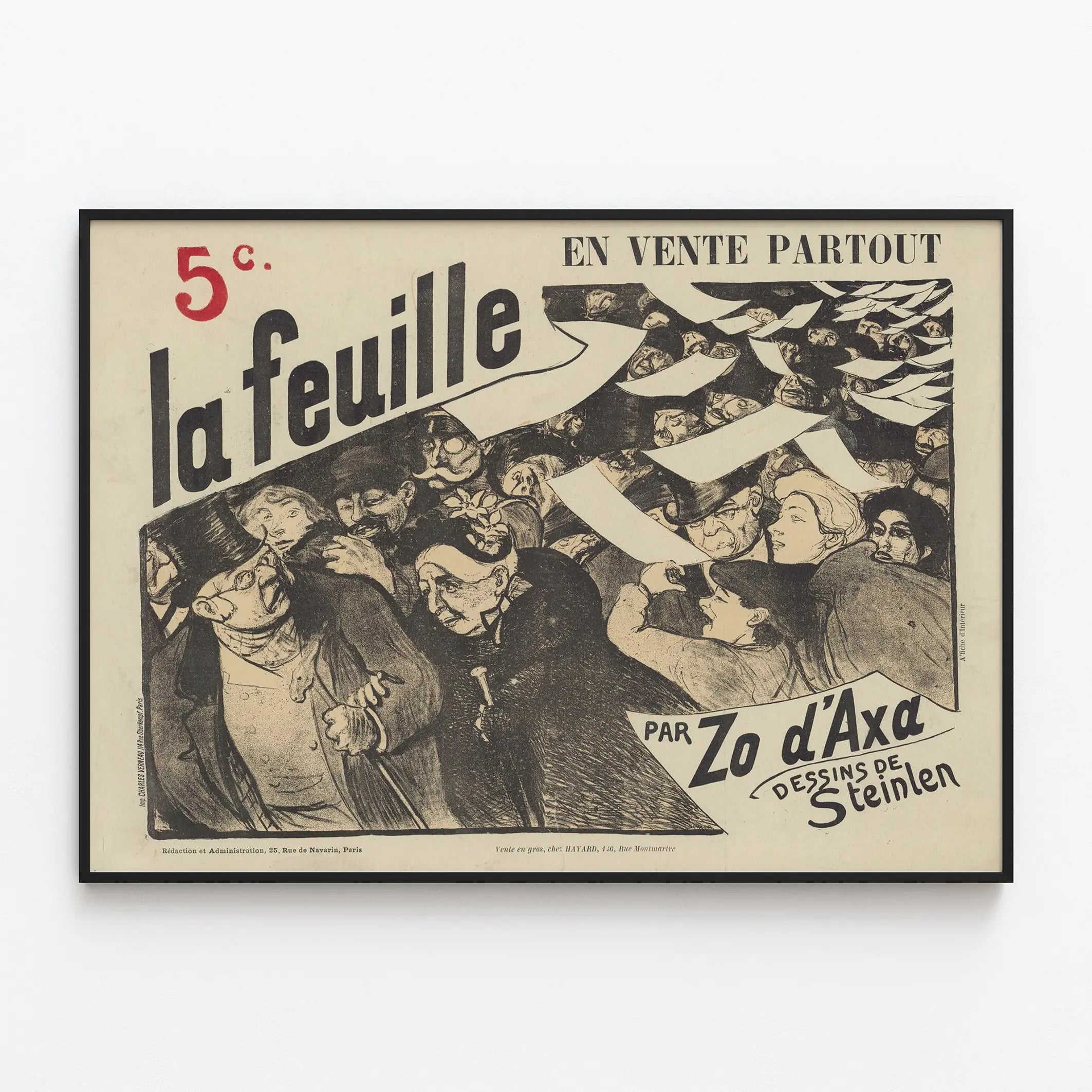 Découvrez cette affiche vintage intitulée "La Feuille", une œuvre remarquable signée Zo d'Axa avec des dessins de Steinlen. Ce poster de style ancien présente une scène animée où plusieurs personnages sont représentés dans un style graphique noir et blanc, accentué par un grand lettrage indiquant "La feuille" et "En vente partout" en haut à droite. Le visuel met en avant une foule diverse, mêlant figures caricaturales et traits expressifs, apportant une ambiance unique à cette composition. L'œuvre, visible dans les détails des expressions des personnages et la dynamique des feuilles ou papiers qui semblent voler, évoque une atmosphère à la fois historique et artistique. Idéal pour une décoration murale originale, ce poster vintage est parfait pour les amateurs de graphisme historique ou de décoration murale avec une touche rétro et artistique. Son format et son esthétique en font un élément décoratif valorisant aussi bien les intérieurs modernes que les espaces dédiés aux amateurs d'art et d'histoire. Cette affiche est également un bel exemple de l’art publicitaire ancien qui a su capturer l’attention par son style visuel marqué et ses détails narratifs. Apportez une touche authentique et culturelle à votre intérieur avec ce poster "La Feuille", qui se distingue par son caractère graphique et son histoire visible à travers chaque trait et ombre du dessin.