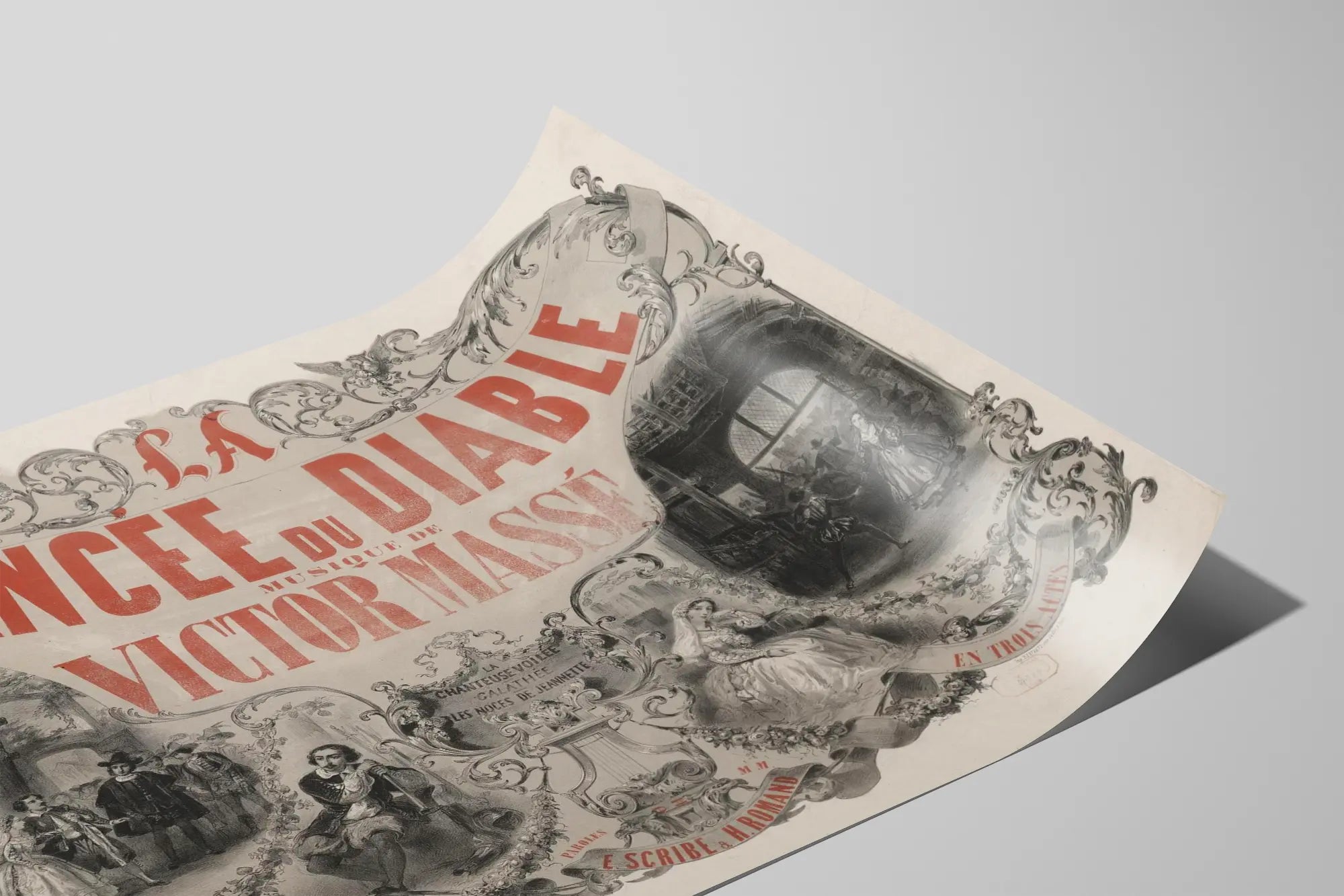 Découvrez cette affiche vintage représentant "La Fiancée du Diable", une œuvre musicale de Victor Massé. Cette décoration murale d'exception, au style ancien et élégant, est idéale pour les amateurs d'opéra comique et de pièces historiques. La composition artistique intègre des éléments décoratifs baroques avec des ornements floraux et un cadre orné qui met en valeur le titre en lettres majuscules rouges, soulignant l'importance et le charme de cette création. Sur cette affiche, trois illustrations détaillées évoquent des scènes de cet opéra en trois actes : personnages costumés en habits d'époque, danse et moments dramatiques, donnant vie à cette production culturelle. La typographie et le choix des couleurs témoignant d'un savoir-faire graphique ancien garantissent une pièce de décoration murale authentique et pleine de caractère. Que vous souhaitiez enrichir votre intérieur avec un poster musical au style classique ou apporter une touche d'histoire de la musique à une collection personnelle, cette affiche constitue une solution idéale. Elle s'adapte aussi bien à un cadre de musée qu'à une ambiance chaleureuse et raffinée chez vous. Parfaite comme tableau décoratif dans un salon, une bibliothèque ou un bureau, elle captive le regard et suscite la curiosité. Cette affiche ancienne valorise à la fois l'esthétique rétro et la richesse culturelle, offrant la possibilité de renouer avec l'univers de l'opéra comique par Victor Massé. Un excellent choix déco pour les passionnés de musique classique, d'histoire du spectacle et de design vintage. Ajoutez une touche de profondeur et d'authenticité à vos murs avec cette affiche remarquable "La Fiancée du Diable".