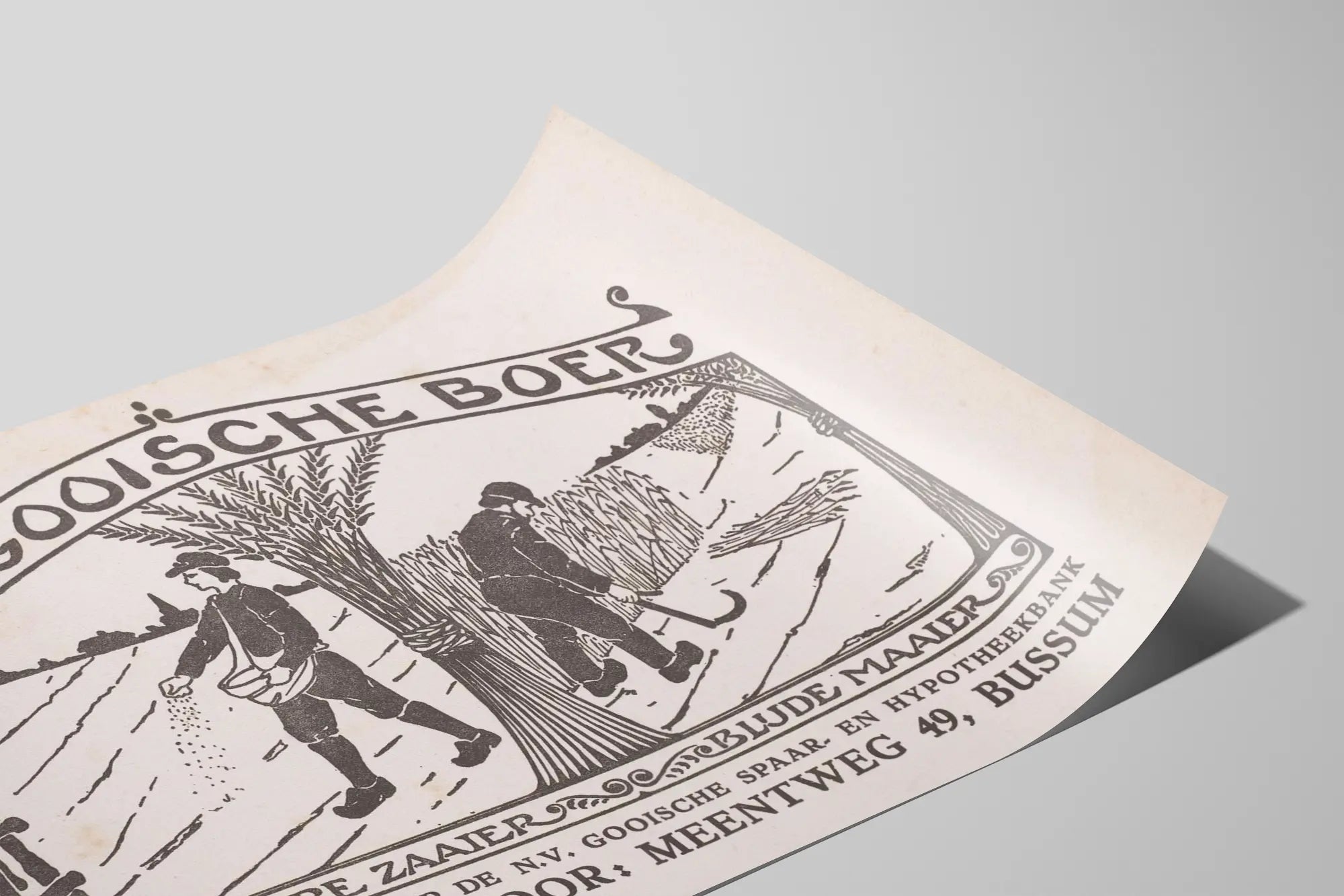 Découvrez cette affiche vintage illustrant la vie rurale à travers une scène traditionnelle de paysans au travail. Cette décoration murale en noir et blanc met en avant deux figures emblématiques : un semeur et un moissonneur, symboles des cycles agricoles. Le semeur est représenté en train de disperser des graines dans un champ soigneusement tracé, tandis que le moissonneur cueille les épis de blé à l'aide d'une faucille. La composition est encadrée par une arche arborée stylisée surmontée du titre « De Gooische Boer », mettant en valeur l'aspect authentique et historique de cette affiche. Le contraste entre les silhouettes noires et le fond clair confère un charme rétro instantané, idéal pour une décoration murale d'ambiance champêtre ou rustique. Parfaite comme poster pour habiller un mur, cette illustration évoque la simplicité et la rigueur du travail agricole traditionnel, tout en apportant une touche artistique à votre intérieur. Affiche typographique et figurative, elle dévoile également une inscription en bas indiquant l'origine et le lieu, renforçant son identité visuelle et culturelle. Ce poster s'intègre parfaitement dans des espaces de vie comme le salon, la cuisine ou même un bureau, pour une décoration murale originale et pleine de sens. Optez pour cette affiche unique qui célèbre la nature et le métier d'agriculteur, idéale pour les amateurs d'art traditionnel et d'histoire rurale.