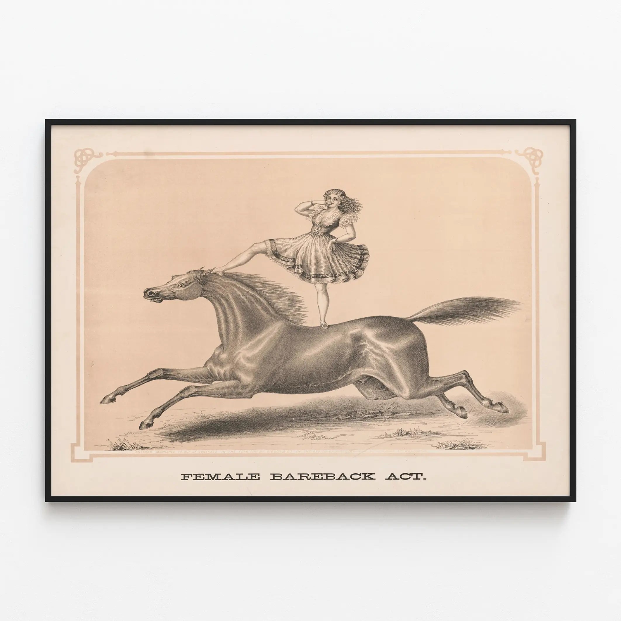 Cette affiche vintage représente une artiste féminine réalisant une figure d’équilibre sur un cheval au galop, illustrant une performance de voltige équestre. Cette illustration en nuances de sépia met en avant un moment spectaculaire où la cavalière, vêtue d'une robe à volants typique de la première moitié du XXe siècle, se tient debout sur le dos du cheval sans selle, illustrant une discipline de voltige appelée "bareback". La posture gracieuse de la femme, avec un bras levé vers son visage et un regard assuré, souligne la maîtrise et l’élégance du spectacle. Le cheval, en pleine foulée, dégage une impression de puissance et de mouvement avec ses muscles dessinés et sa crinière en plein vent. Le cadre ornant l'image est décoratif et rappelle les styles d’illustrations anciennes souvent utilisées dans les affiches publicitaires ou les posters de spectacles de cirque d’époque. Cette décoration murale s'adresse particulièrement aux amateurs de chevaux, d'histoire du cirque ou de performances artistiques équestres, apportant une touche rétro et raffinée à tout intérieur. Idéale comme affiche encadrée ou poster déco, elle saura sublimer un salon, un bureau ou une salle dédiée aux arts équestres. Ce tableau imprimé propose un style unique mêlant art et spectacle, parfait pour ceux qui souhaitent enrichir leur décoration murale avec une touche d'authenticité et de nostalgie. Cette œuvre vintage est aussi un excellent choix pour les collections d’affiches et posters classiques à thème animalier et artistique. Enrichissez vos murs avec cette illustration captivante et intemporelle, symbole d’équilibre, d’audace et de grâce dans le monde équestre.