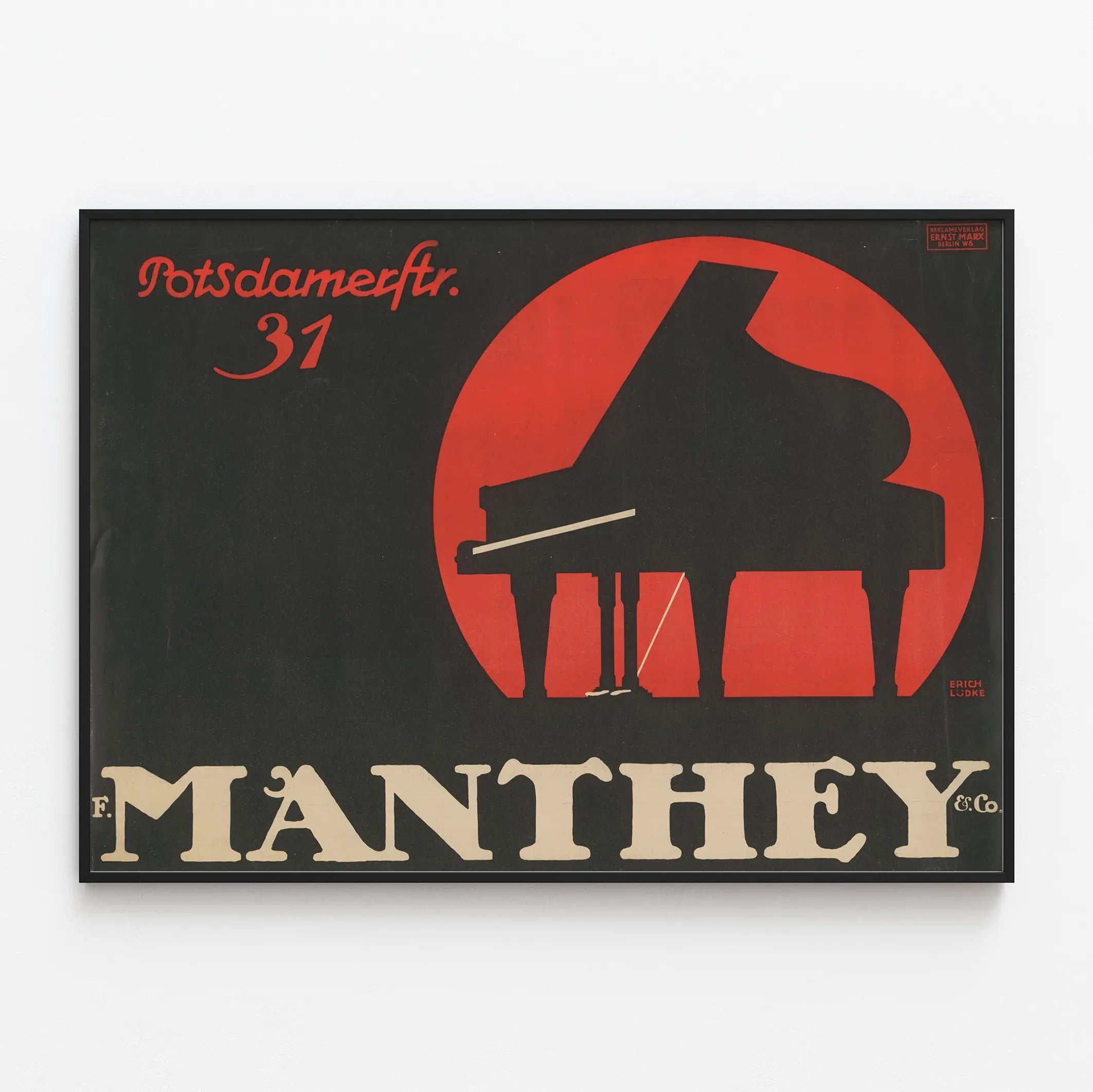 Découvrez cette affiche vintage emblématique mettant en scène la silhouette d'un piano à queue stylisé en noir sur un fond rouge circulaire. Ce poster publicitaire ancien présente la mention « Potsdamerstr. 31 » en haut à gauche, indiquant une adresse probablement liée au commerce F. Manthey & Co, dont le nom figure en bas, en lettres blanches marquantes sur un fond noir. La composition graphique se distingue par son contraste fort entre le rouge vif et le noir profond, évoquant une esthétique rétro élégante, parfaite pour une décoration murale originale. La simplicité des formes et la mise en page équilibrée apportent une touche d'authenticité et de charme d'époque à tout intérieur. Une affiche murale idéale pour les amateurs de musique et de design vintage, ce poster s'intègre parfaitement dans un salon, un bureau ou une salle de musique, offrant un rendez-vous visuel entre art et culture musicale. Avec ses lignes épurées et son style typographique ancien, cette décoration murale représente un objet décoratif à la fois artistique et évocateur, parfait pour enrichir un mur avec une pièce qui respire l’histoire et le caractère. Un tableau mural qui capture la nostalgie du passé, offrant une ambiance chaleureuse et sophistiquée grâce à son jeu de couleurs et à son graphisme emblématique.