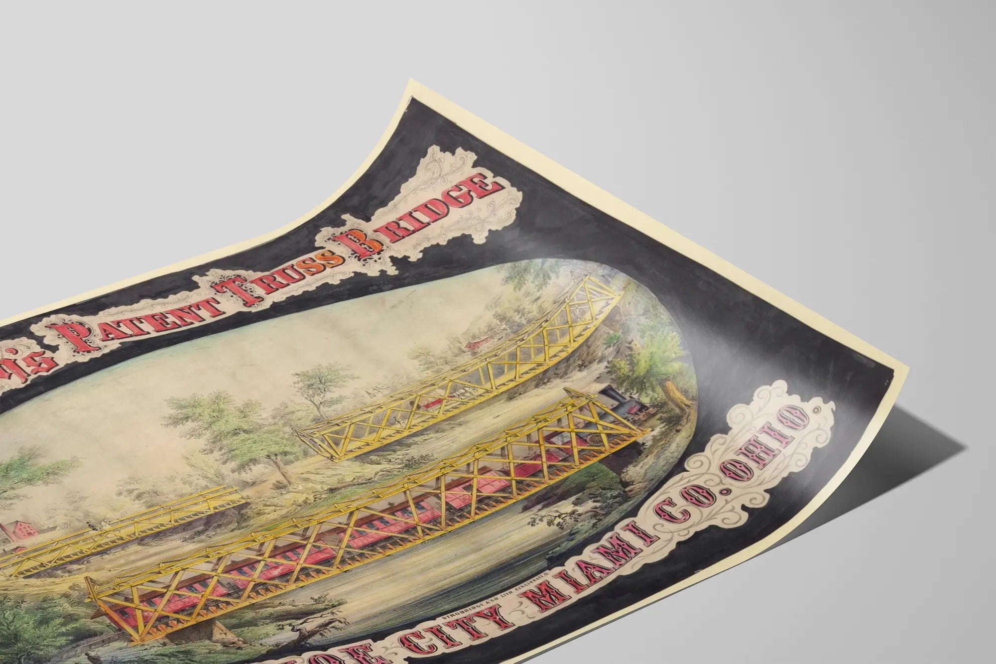 Cette affiche vintage unique met en lumière le pont à treillis breveté R.W. Smith, situé à Tippecanoe City dans le comté de Miami, Ohio. Représentée en couleurs délicates, cette illustration montre trois vues détaillées du pont, avec sa structure métallique jaune caractéristique. Le pont traverse une rivière paisible dans un décor naturel fait de rives verdoyantes, arbres et collines en arrière-plan. Un train à vapeur traverse la scène principale avec des personnages et chevaux ajoutant du réalisme et de la vie à la composition. Le lettrage en rouge et noir élégamment décoré encadre l’image, apportant une touche historique et artistique. Cette décoration murale est parfaite pour les amateurs d’architecture industrielle ancienne, d’ingénierie ou d’histoire américaine. Affiche idéale pour habiller un mur avec une touche d’authenticité et un style rétro, elle invite à la contemplation d’un patrimoine industriel unique. Disponible en poster ou tableau, cette pièce apportera une atmosphère vintage et technique à votre intérieur ou bureau, pour les passionnés de ponts et constructions métalliques historiques.