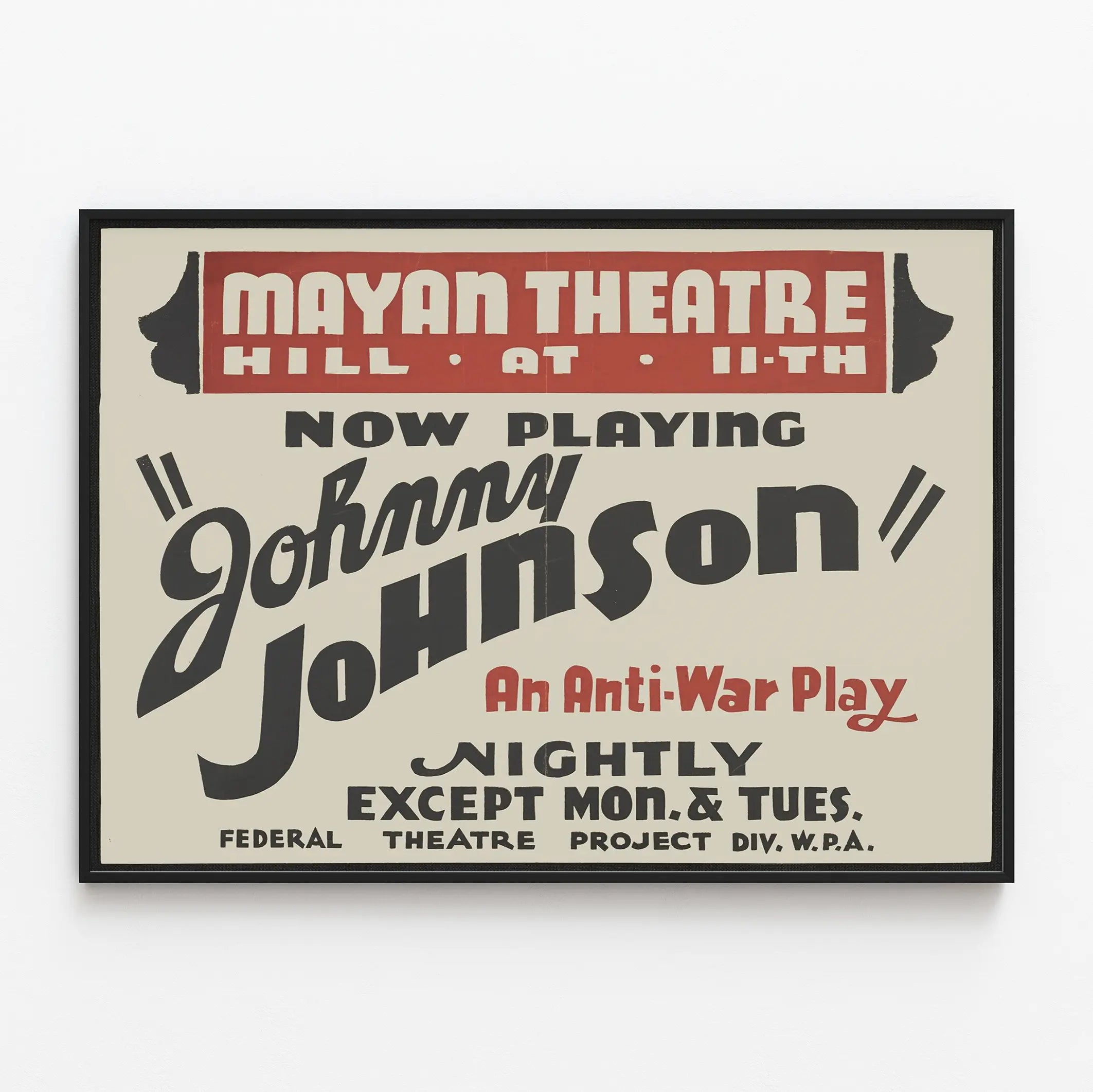 Affiche vintage pour la pièce anti-guerre Johnny Johnson au Mayan Theatre