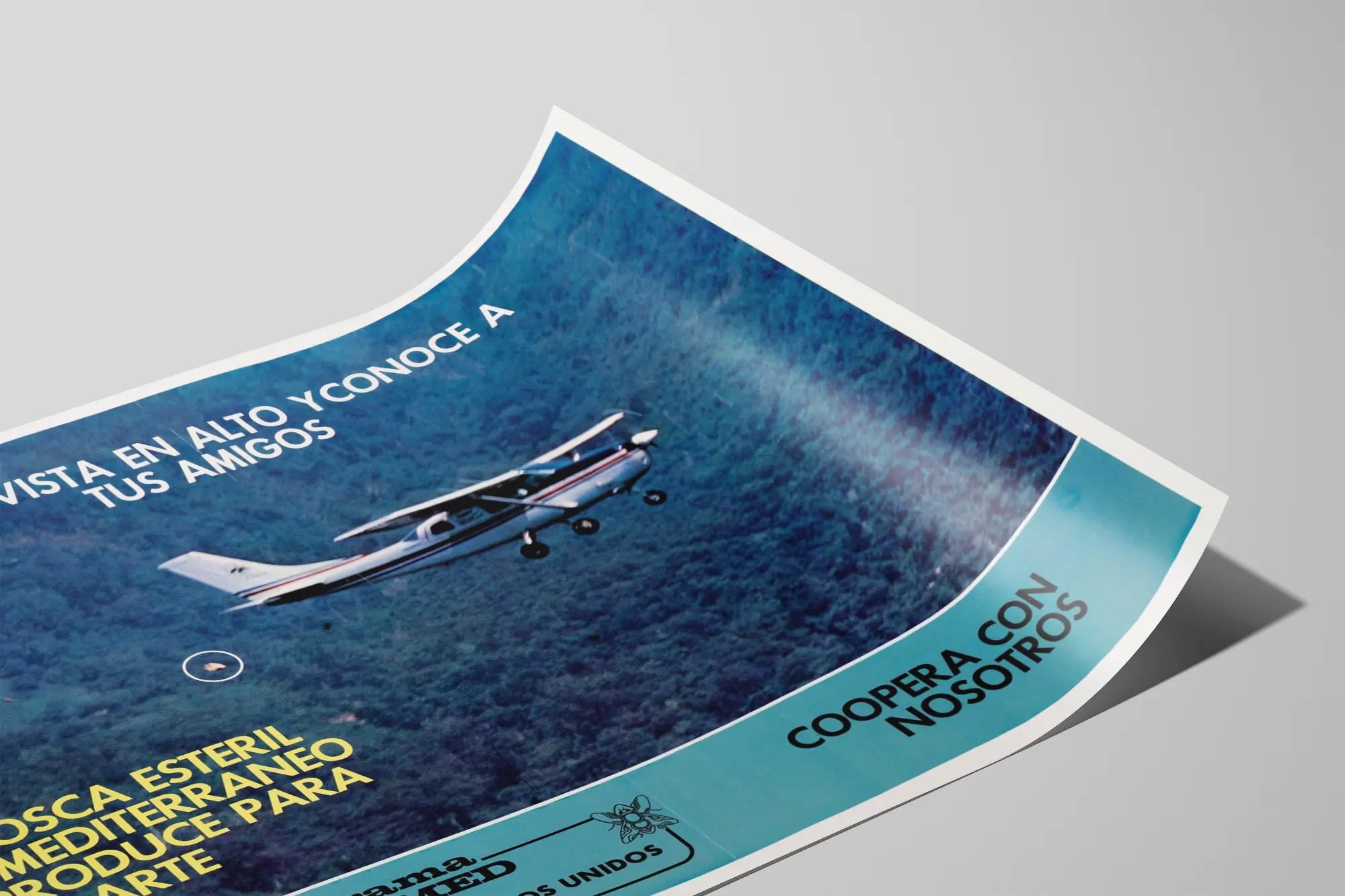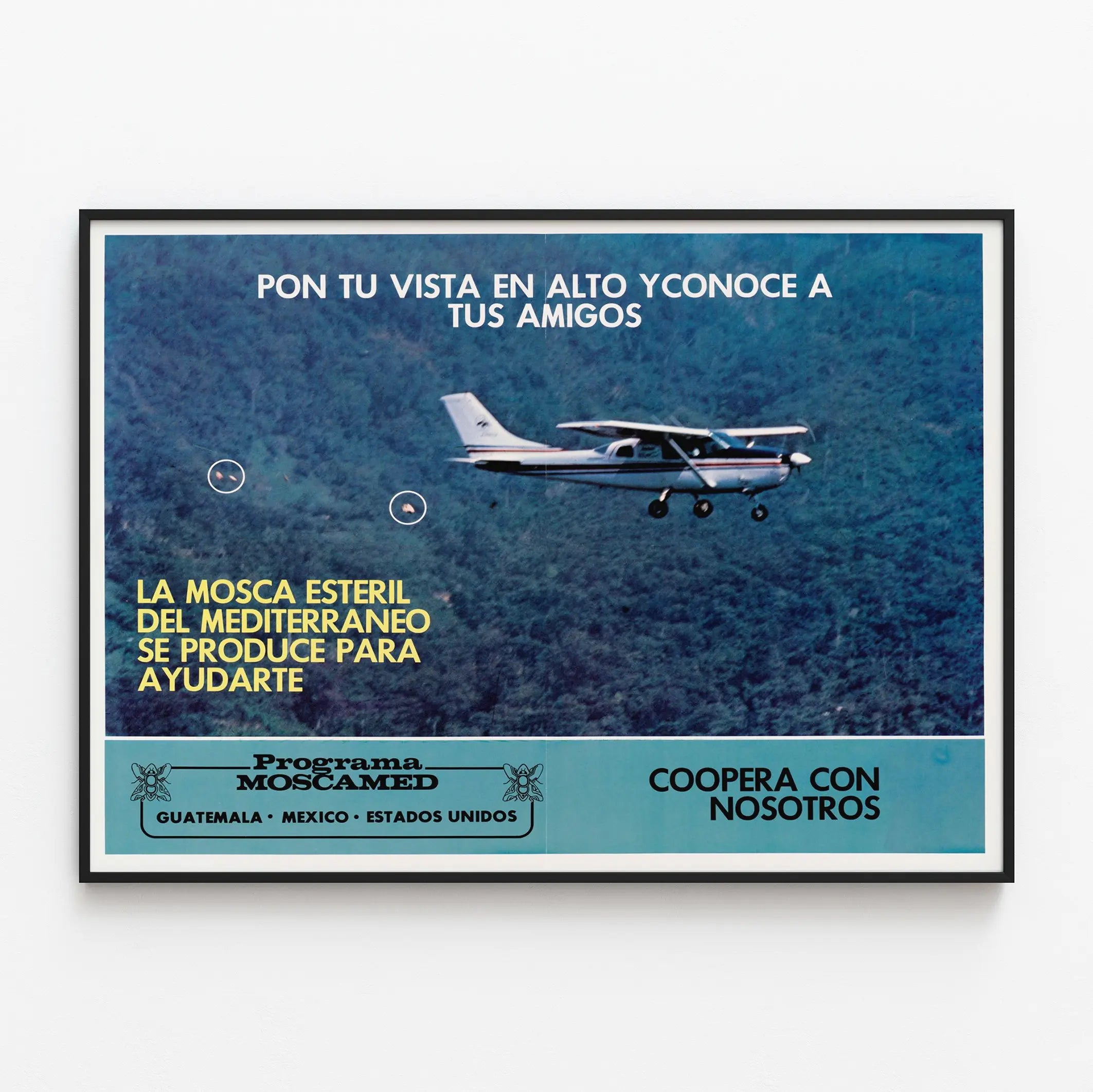 Cette affiche vintage du Programme Moscamed, réalisée pour la promotion de la lutte contre la mouche méditerranéenne, présente une scène aérienne remarquable. On y observe un petit avion de surveillance survolant une étendue dense de forêt, capturant le déploiement de mouches stériles dans leur habitat naturel. La phrase en espagnol sommant « Pon tu vista en alto y conoce a tus amigos » (Lève les yeux et rencontre tes amis) invite à prendre conscience de ce programme innovant. Cette décoration murale évoque la collaboration entre le Guatemala, le Mexique et les États-Unis dans cette initiative environnementale unique. L'affiche, par son présentation visuelle et textuelle, est un excellent exemple d’art graphique utilisé pour sensibiliser le public aux efforts scientifiques et écologiques. En tant qu'élément de décoration murale, elle apportera une touche originale et informative à tout espace, mêlant esthétique et message engagé. Ce poster vintage est idéal pour les amateurs de décoration murale qui apprécient les affiches au style rétro et à vocation éducative, ou pour ceux passionnés par la protection de l’environnement et les campagnes de santé publique.