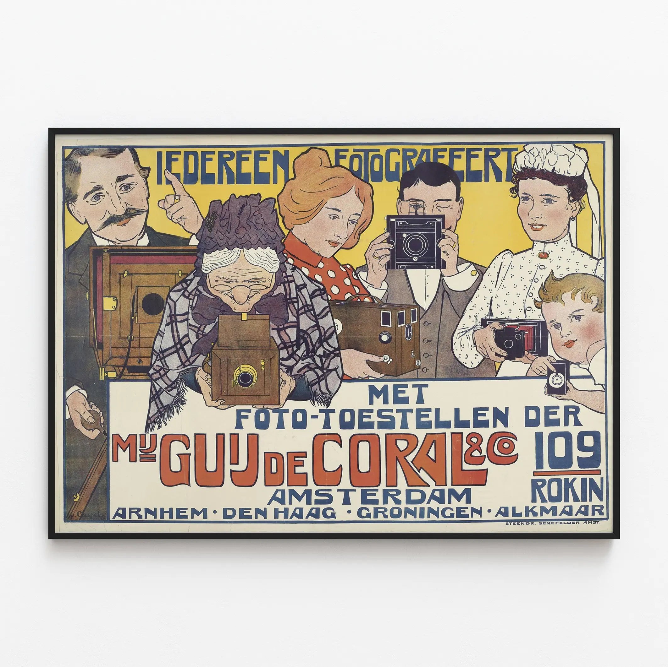 Cette affiche vintage au design unique est une véritable pièce de décoration murale pour les amateurs d’histoire de la photographie et les passionnés de vintage. Elle met en scène plusieurs personnages de générations différentes, chacun tenant un appareil photo ancien, illustrant ainsi la démocratisation de la photographie avec le slogan « Iedereen Fotografeert » qui signifie « Tout le monde est photographe ». Cette affiche publicitaire en langue néerlandaise est idéale pour apporter une touche rétro et authentique à votre intérieur. Elle illustre la diversité des formats et modèles d’appareils photo d’époque, du plus ancien au plus moderne, offrant un aperçu fascinant de l’évolution technologique et culturelle de la photographie. Affiche ou poster, cette décoration murale est parfaite pour les salons, bureaux ou studios photo, apportant un charme d’antan teinté d’un message universel sur la photographie accessible à tous. Son style graphique et ses couleurs vives attirent le regard, faisant de cette affiche un tableau murale original et inspirant. Décorez vos murs avec cette affiche rétro et artistique qui valorise la photographie comme art à la portée de chacun, tout en rappelant les racines historiques des appareils photo anciens et leur place dans la culture populaire.