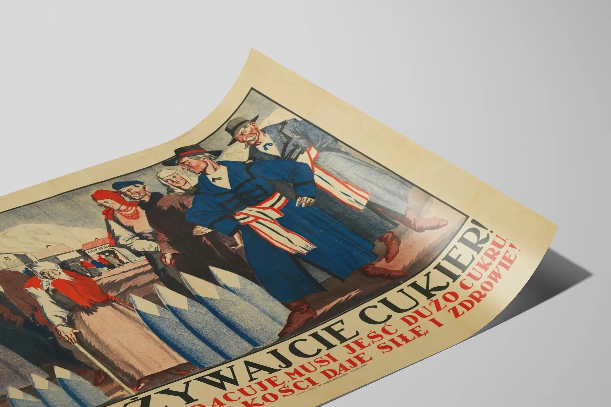Cette affiche vintage polonaise constitue une décoration murale originale, parfaite pour un intérieur au style rétro ou une cuisine à l'ambiance chaleureuse. Représentant un groupe d'individus en habits traditionnels, elle met en valeur le message "Spożywajcie cukier !" qui signifie "Consommez du sucre !". Ce poster illustre une époque où le sucre était promu comme un aliment essentiel à la santé et à la vigueur physique, notamment pour ceux qui travaillent beaucoup.