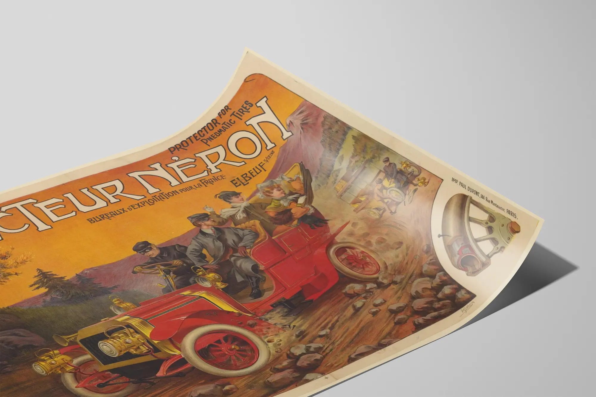 Découvrez cette affiche vintage intitulée « Protecteur Néron », une pièce unique de décoration murale inspirée de l'univers automobile du début du XXe siècle. Cette affiche publicitaire met en avant un dispositif de protection pour pneus pneumatiques, illustré par une scène dynamique où une voiture rouge traverse une route caillouteuse sans endommager ses pneus grâce au protecteur Néron. L'illustration très détaillée montre des personnages en tenue d'époque, soulignant l'élégance et l'aventure du voyage en automobile à cette époque. Ce poster trouve sa place dans une décoration murale dédiée aux passionnés d'histoire automobile, de design vintage ou de publicité ancienne. Le dessin met en valeur la robustesse et l'innovation du produit, tout en conservant un charme rétro accentué par des couleurs chaudes et un lettrage typique des affiches publicitaires françaises d'autrefois. Idéal pour orner un bureau, un garage ou une salle de séjour, ce tableau décoratif apporte une touche d'authenticité et de nostalgie à votre intérieur. La représentation du protecteur pour pneus sur un plan rapproché dans le coin de l'affiche ajoute une note technique qui séduira les amateurs de mécanique ancienne. Cette affiche vintage s’intègre facilement dans un style de décoration murale industrielle ou rétro, alliant aspect esthétique et intérêt historique. Ajoutez un élément unique à votre collection de posters avec cette publicité d’Elbeuf, un témoignage visuel de l’ingéniosité et du style d’époque, parfaitement adaptée pour valoriser un espace avec une touche d’originalité et d'authenticité.