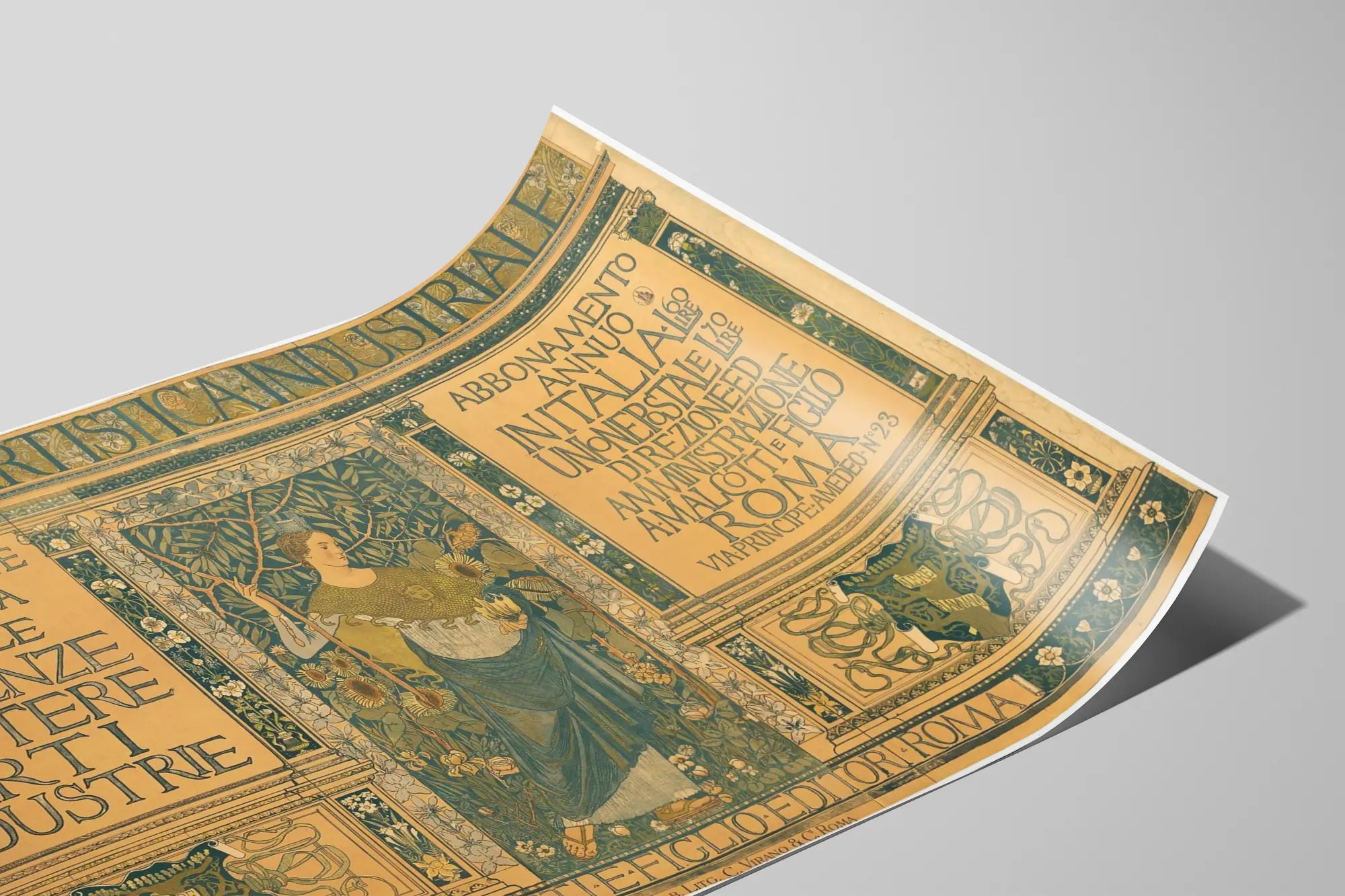 Découvrez cette affiche vintage formatée en art déco intitulée "Pubblicazione L'Italia Artistica e Industriale", une pièce graphique unique pour votre décoration murale. Cette affiche met en valeur le style ornemental italien avec des éléments floraux et des motifs architecturaux inspirés par la belle époque. Au centre, une figure féminine élégante est entourée de tournesols et d’un paysage végétal stylisé, soulignant une harmonie entre nature et art, typique des créations Art Nouveau.