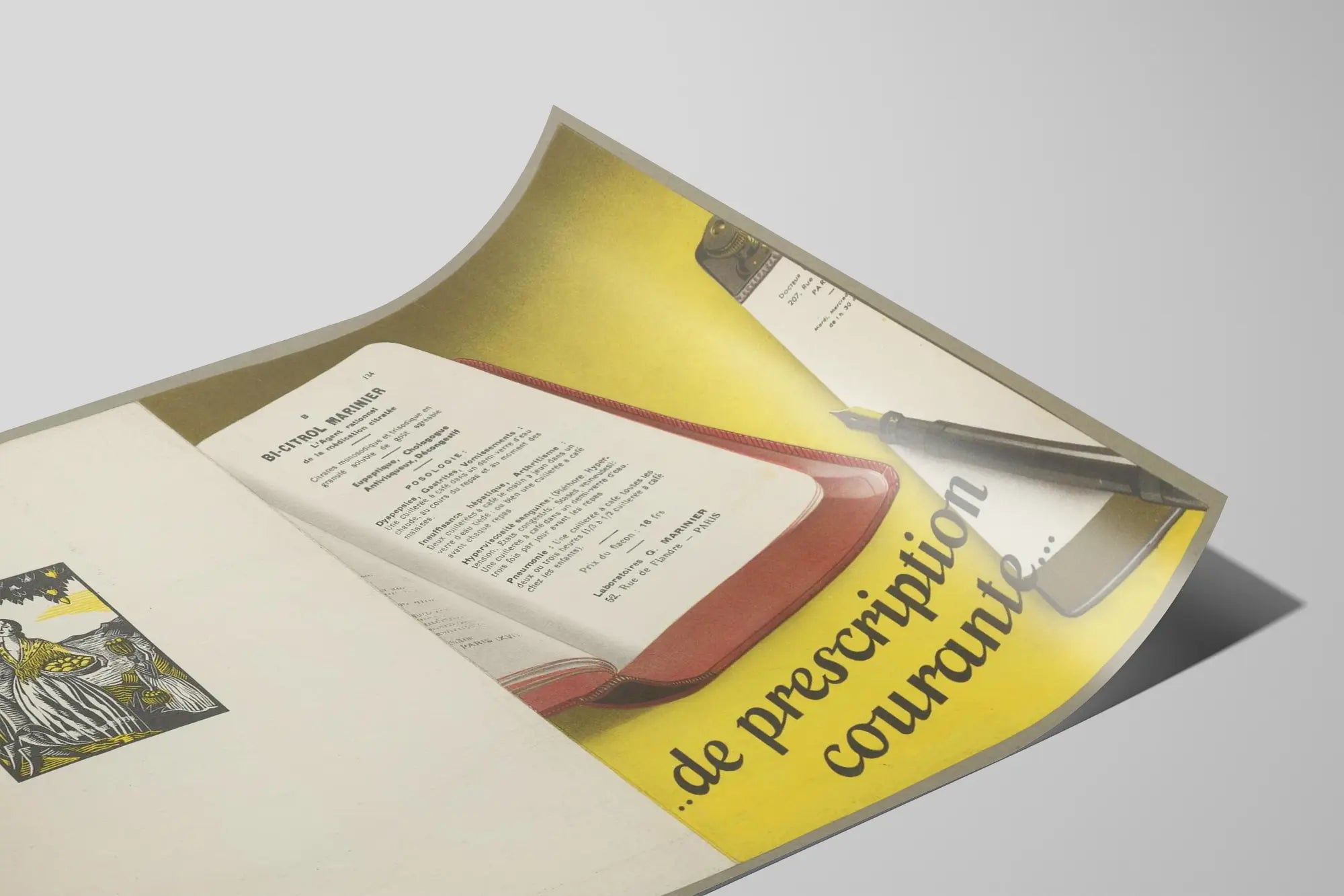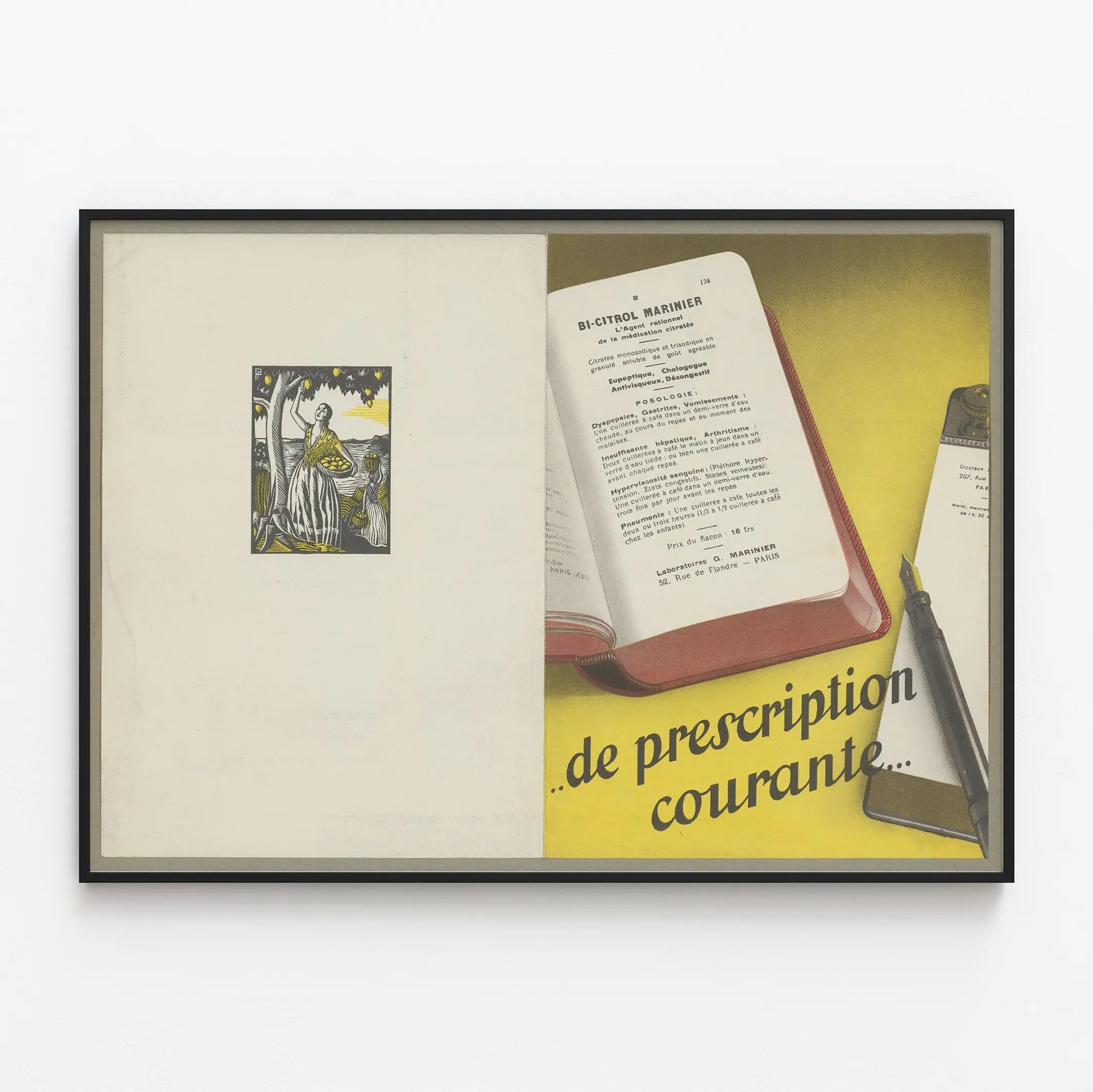 Découvrez cette affiche vintage qui met en avant le médicament Bi-Citrol Marinier, un granule soluble à base de citrates monosodique et trisodique, présenté comme un agent rationnel de la médication citratée. Cette décoration murale d'époque illustre un manuel ouvert sur une posologie détaillée, accompagné d'un stylo-plume et d'un cachet médical, sur un fond jaune lumineux apportant dynamisme et chaleur à l'ensemble. Parfaite pour les amateurs de décoration murale rétro ou les passionnés d'affiches publicitaires médicales du milieu du XXe siècle, cette pièce affiche une typographie élégante et un design authentique. En tant que poster de prescription courante, elle apporte une ambiance à la fois historique et graphique à votre intérieur. Ce tableau publicitaire, avec sa suggestion d'effets antiépileptiques, cholagogues, antiviraux et décongestifs, peut servir de point focal dans une salle de consultation, un cabinet médical ou une pièce dédiée au style vintage. Son style sobre et épuré, mêlant texte clair et éléments graphiques, en fait aussi une affiche décorative adaptée aux environnements modernes désirant une touche d'authenticité et de caractère. Ce poster de qualité met en valeur un produit pharmaceutique historique tout en offrant une esthétique rétro-chic appréciée au sein des collections de décoration murale. Mettez en valeur vos murs avec cette affiche Bi-Citrol Marinier, symbole d'une époque où la publicité se mêlait à l'art mural pour informer avec élégance et simplicité.