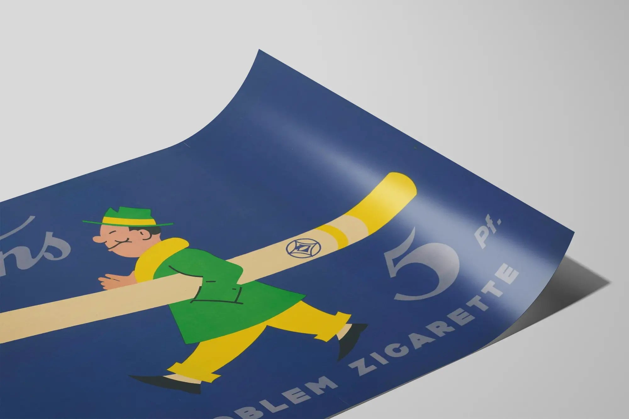 Cette affiche vintage publicitaire met en scène un personnage stylisé portant une grande cigarette sur l'épaule, dans un style graphique épuré et coloré. Le fond bleu profond crée un contraste saisissant avec les couleurs vives du personnage habillé d'un manteau vert, d'un pantalon jaune et d'un chapeau assorti. Le texte "Trans" et "Die Problem Zigarette" est imprimé en lettres claires, offrant une identité visuelle rétro très marquée. L'illustration évoque une ambiance publicitaire des années passées, parfaite pour une décoration murale qui apporte une touche de nostalgie industrielle et une esthétique vintage reconnue. Idéale en poster, cette décoration murale s'intégrera avec charme dans un intérieur contemporain ou classique, donnant à votre espace un accent unique et authentique. Ce tableau mural s'adresse aux amateurs de design rétro, d'affiches publicitaires anciennes et de graphisme simple mais percutant. En combinant couleurs franches et composition équilibrée, cette affiche devient un élément central de votre décoration intérieure. Elle convient particulièrement aux pièces à vivre, bureaux, restaurants ou espaces dédiés à la culture vintage et au style industriel. Optez pour ce poster décoratif pour révéler une atmosphère pleine de caractère et évoquer l'histoire de la publicité liée au monde du tabac. Ce produit est une superbe idée de cadeau pour les passionnés d'art graphique rétro et de décoration murale originale, offrant une décoration murale qui capte l'œil et invite à une ambiance authentique.