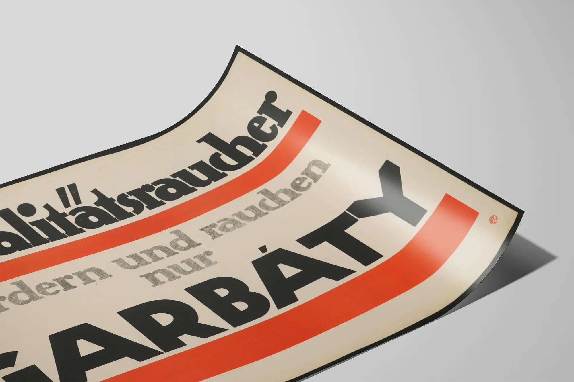 Cette affiche vintage présente une typographie audacieuse et minimaliste en noir et rouge sur un fond blanc cassé, idéale pour une décoration murale au style rétro et industriel. Le texte en allemand "Qualitätsraucher fordern und rauchen nur GARBATY" se traduit approximativement par « Les fumeurs de qualité exigent et ne fument que GARBATY », mettant en avant la marque Garbaty, probablement une référence à un produit lié au tabac. Cette affiche ornementale joue sur la mise en forme typographique simple mais impactante, avec des bandes rouges soulignant le message principal pour attirer le regard et renforcer le contraste des caractères. Utilisée comme décoration murale, cette affiche apporte une touche authentique à un intérieur vintage, une salle fumeur, ou un espace détente aux inspirations industrielles ou rétro. Elle peut également s'intégrer harmonieusement dans une collection d'affiches publicitaires d'époque, affirmant un style singulier et une atmosphère nostalgique. Affiche au design graphique épuré, elle offre un rendu visuel fort et aujourd'hui encore très esthétique. Ce poster est parfait pour les amateurs de décoration murale originale et ceux qui recherchent des pièces uniques avec une touche historique imprimée. Sa composition équilibrée, son jeu de couleurs sobres et ses polices aux formes géométriques en font un élément décoratif tendance pour tout intérieur contemporain, salon ou bureau à la recherche d'un style signé par l'univers de la publicité ancienne.