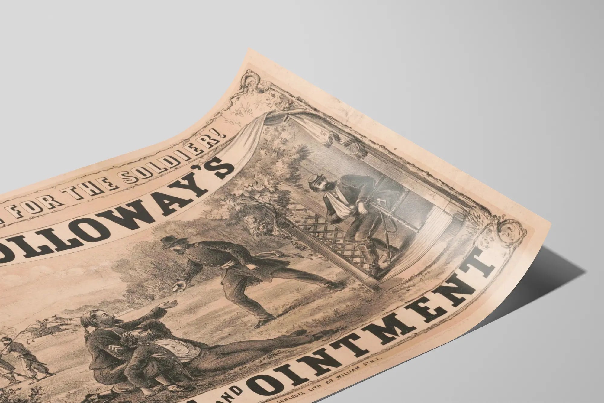 Découvrez cette affiche vintage illustrant la publicité d'époque pour Holloway's Pills and Ointment, un poster historique destinée à la décoration murale. Cette décoration murale rétro met en scène une scène militaire avec des soldats, soulignant l'usage supposé des produits Holloway pour la santé des soldats. Ce tableau graphique au style gravure est encadré d'éléments décoratifs qui renforcent son caractère ancien et authentique. L'affiche est un bel exemple d'art publicitaire du 19e siècle, un objet de décoration murale qui apporte une touche historique et vintage à votre intérieur. Idéal pour les amateurs de posters anciens, cette pièce unique capte l'attention par ses détails illustratifs et son message fort centré sur la santé et le bien-être des soldats. Ce poster décoratif peut s'intégrer parfaitement dans un salon, un bureau ou un espace dédié à l'histoire militaire ou à la collection d'affiches anciennes. Son format et sa composition soigneusement équilibrée en font un élément de choix pour enrichir une décoration murale authentique ou originale. Ce tableau publicitaire est un hommage visuel à une époque où les affiches servaient à promouvoir des remèdes populaires avec un art détaillé et expressif.