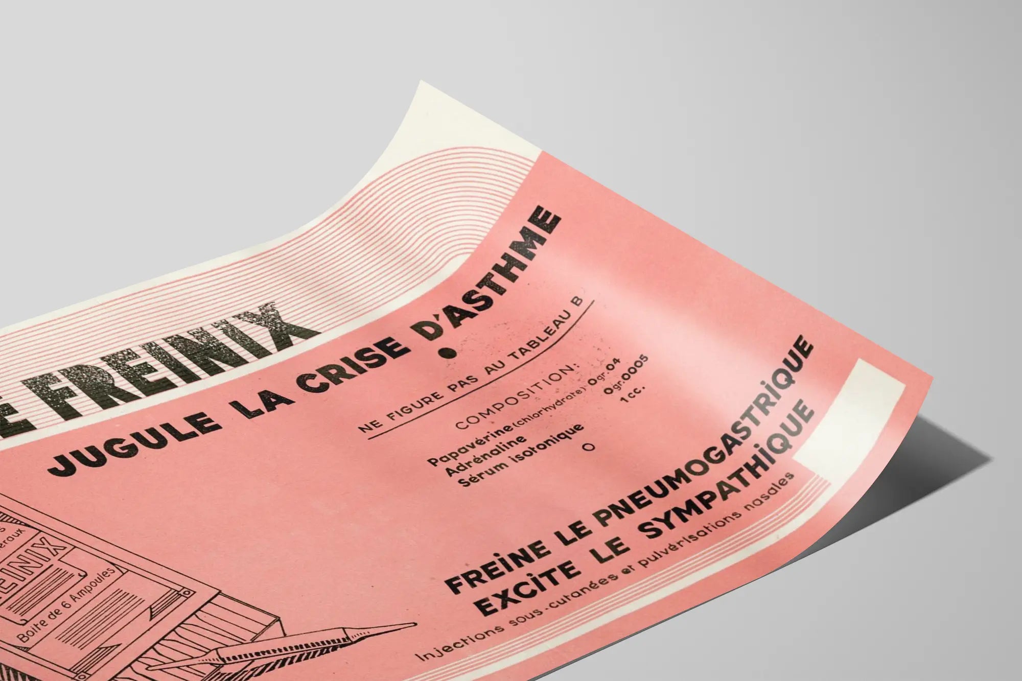 Cette affiche vintage présente Le Freinix, un produit conçu pour juguler la crise d'asthme ainsi que d'autres affections respiratoires telles que l'emphysème, le rhume des foins et les spasmes viscéraux. La composition indiquée comprend de la papavérine (chlorhydrate), de l'adrénaline et du sérum isotonique, détaillant une solution médicamenteuse administrée par injections sous-cutanées et pulvérisations nasales. La mise en page joue sur des contrastes de couleurs pastel avec un fond rose et des éléments graphiques en noir, incluant un dessin d'une boîte de six ampoules Freinix, soulignant un style rétro rappelant la publicité pharmaceutique du milieu du XXe siècle. Cette affiche est un élément de décoration murale unique, parfait pour les amateurs de design rétro et vintage qui souhaitent ajouter une touche d'originalité à leur intérieur. Son style typographique marqué, avec des caractères gras en noir sur fond coloré, renforce l'aspect publicitaire classique et authentique. Elle s'intègre parfaitement dans un salon, un bureau ou une salle d'attente pour créer une atmosphère à la fois historique et esthétique. En tant que poster, cette image vintage peut servir de point focal dans une décoration murale thématique ou servir d'objet de collection lié à la médecine ancienne et aux campagnes publicitaires classiques. Son format horizontal et équilibré facilite son intégration dans différents cadres ou sous verre, valorisant ainsi sa présence dans tout espace design. Les lignes graphiques arrondies en haut à droite apportent une dynamique visuelle intéressante et modernisent l'ensemble sans perdre l'esprit rétro. Choisir cette affiche comme décoration murale, c'est opter pour un objet qui ne se contente pas d'embellir un espace, mais qui raconte aussi une histoire, celle d'une époque où la publicité médicale prenait une place importante dans la communication visuelle. Elle peut également inspirer des aménagements vintage ou industriels, contribuant à une ambiance chaleureuse et originale. Son sujet, tourné vers une solution pour les crises d'asthme, confère une dimension informative et empathique, soulignant les préoccupations de santé publique anciennes. Ce poster représente donc une alliance entre esthétique, histoire et culture médicale, attirant les passionnés de décoration murale désireux d'ajouter une pièce authentique et pleine de caractère à leur collection.