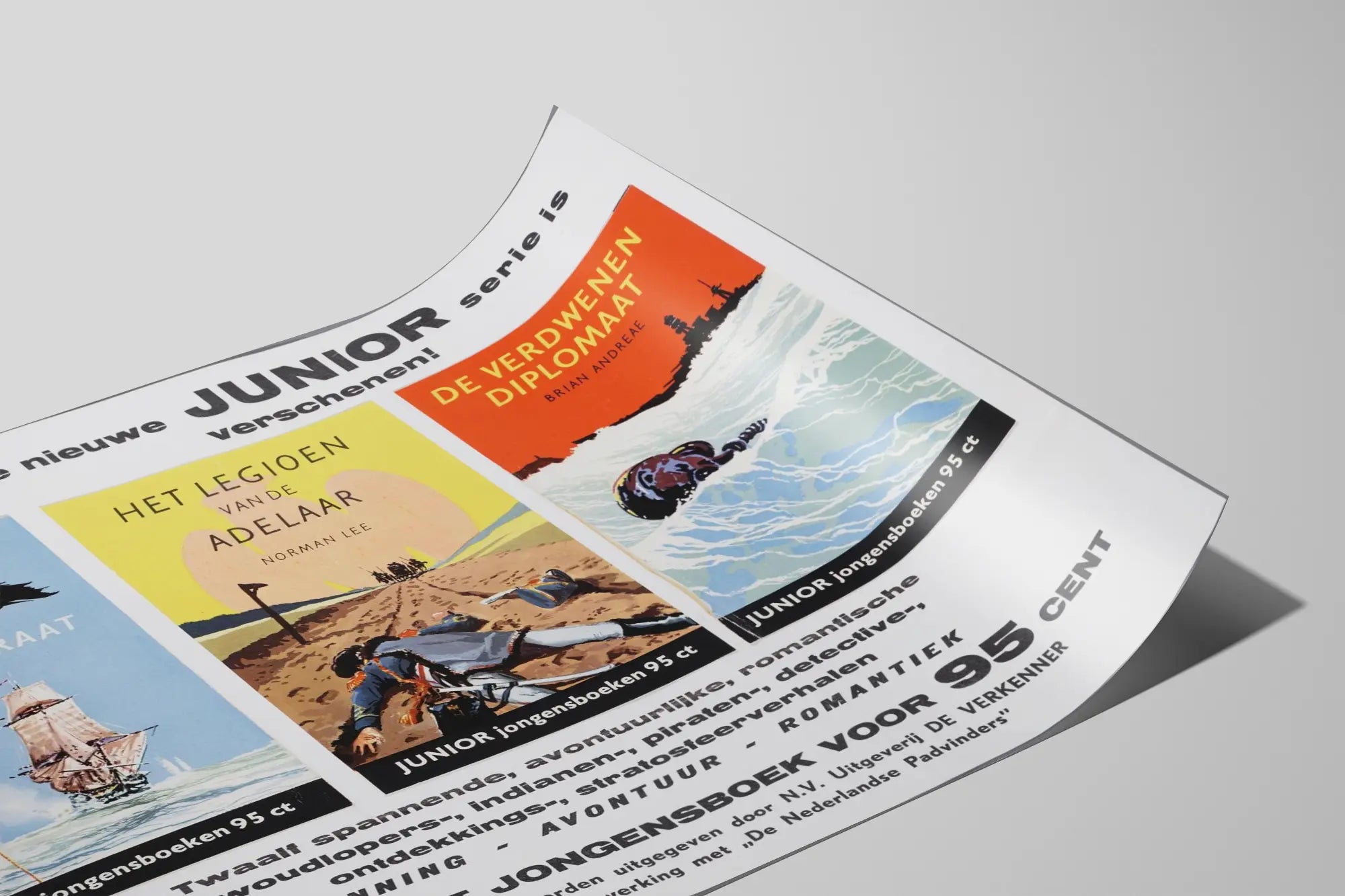 Cette affiche vintage présente une série captivante destinée aux jeunes, intitulée « Junior », mettant en avant trois livres d'aventure. Chaque affiche évoque un univers distinct : « De spookpiraat » montre un navire pirate avec un drapeau noir orné d'une tête de mort sur un fond ciel bleu, « Het legioen van de Adelaar » illustre une scène dramatique avec des soldats tombés sur une route sous un grand soleil rougeâtre, et « De verdwenen diplomaat » représente une mer agitée avec une silhouette de bâtiment éloigné en arrière-plan. Ces œuvres illustrent parfaitement le thème de la décoration murale avec des graphismes forts et expressifs, idéaux pour une chambre d'enfant ou un espace de lecture dédié. La palette de couleurs est variée, allant du bleu apaisant au jaune vif en passant par un orange intense, apportant dynamisme et énergie à ces posters. Cette série est conçue pour capturer l'imaginaire des jeunes passionnés d'aventures et de mystères, en mêlant des éléments de piraterie, de légions combattantes et d'espionnage diplomatique. Elle évoque également une atmosphère romantique et audacieuse, parfaite pour enrichir un décor mural avec une touche de nostalgie et d'exploration. Ces affiches sont un excellent choix pour les amateurs de décoration murale cherchant à insuffler une ambiance vintage et narrative dans leur intérieur.
